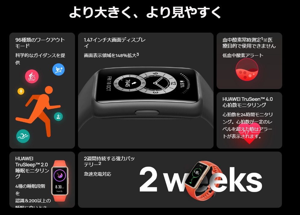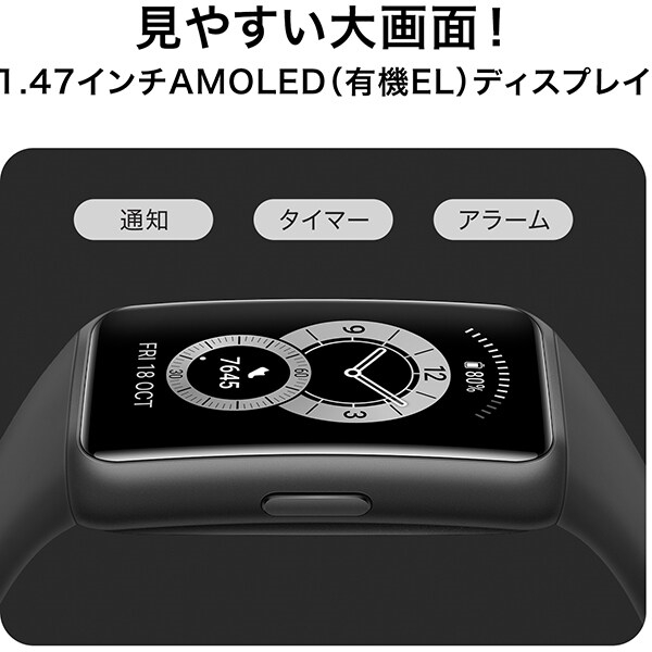 | 商品説明 | HUAWEI ファーウェイ スマートウォッチ BAND6/BLACK [スマートバンド Band 6 グラファイトブラック/睡眠ストレス等モニタリング] です。 国内大手家電量販店購入の新品未開封品です。正規品。 即決です。消費税はかかりません。 ◆製品 1.47型のAMOLED大画面ディスプレイを搭載したスマートバンド。 通常使用で14日間、ヘビーユースで10日間のバッテリー持続時間を実現。 24時間血中酸素レベル測定に対応。 血中酸素レベルが設定値よりも低く測定された場合、本体が振動しアラートを出す。 心拍数モニタリングや睡眠モニタリング、ストレスモニタリング、 月経周期トラッキングなど健康管理に役立つ機能を搭載。 ■鮮やかなフルビジョンディスプレイ 1.47インチのAMOLED 大画面ディスプレイを搭載。 以前のモデル「HUAWEI Band 4 Pro」と比べて画面表示領域が148%拡大し、 大きな画面で操作もしやすくなりました。 また、画面占有率も「HUAWEI Band 4 Pro」と比べて42%向上し、 より様々なデータを画面上で見ることができるようになりました。 ■あなたのデータをより大きく、より見やすく 画面占有率が高い大画面ディスプレイは、見た目だけでなく、 より多くのデータを提供します。 より大きな写真、より多くのエクササイズデータ、 リアルタイムで計測されている心拍数などが詳細に表示されます。 また、直感的に操作できる4WAYタッチスクリーンを採用しているので、 より自由にデータを見ることができます。 ■血中酸素常時測定に対応 血中酸素の常時測定※に対応。 常時測定機能を有効にしておけば、血中酸素レベルが設定値よりも低く測定された場合に、 本体が振動しアラートを出します。 常時測定機能を有効にするには、HUAWEI Healthアプリを最新へとアップデートし、 アプリ上のデバイスタブからヘルスケア設定に入り、 「血中酸素の自動測定」を有効にする必要があります。 ※本製品は一般的なウェルネス・フィットネス目的の製品であり、 医療機器として設計されたものではなく、 病気などの診断、治療、予防の目的にはご使用いただけません。 また、常時測定とは一定期間毎の計測値を定期的に表示することを意味しています。 ■健康管理に役立つ機能満載 心拍数モニタリング、睡眠モニタリング、ストレスモニタリング、 月経周期トラッキング※など健康管理に役立つ機能を搭載しています。 ※ Androidスマートフォンのみ対応。 ・心拍数モニタリング HUAWEI TruSeen 4.0心拍数モニタリング技術は、 光学式センサーとAIアルゴリズムにより、心拍数を24時間モニタリング。 心拍数が安全なレベルを超えた時はアラートが表示されます。 ・睡眠モニタリング HUAWEI TruSleep 2.0は、深い睡眠、浅い睡眠、レム睡眠、昼寝の 4つの異なる睡眠状態のいずれかを検出。 また、6つの主要な睡眠課題を特定し、200以上のアドバイスを提供します。 ・ストレスモニタリング HUAWEI TruRelaxストレスモニタリングで1日のストレスレベルをモニタリングできます。 ストレスが高まったときには本体に内蔵された呼吸エクササイズを使用することで、 リラックスして集中できる状態に促します。 ・月経周期トラッキング※ 月経周期のカレンダーを簡単に管理できます。 生理日が近づいてきたら、タイムリーにお知らせします。 ※ Androidスマートフォンのみ対応。 ■2週間持続する強力バッテリー搭載 通常使用※1で約14日間、ヘビーユース※2で約10日間というバッテリー持続時間を実現。 また、充電ポートを使ってわずか5分の充電で約2日間の通常使用※1ができるため、 急にバッテリー切れに気づいても心配ありません。 ※1 通常使用は、24時間心拍数モニタリングON、 睡眠モニタリングがON(HUAWEI TruSleep OFF)、 メッセージ通知ON(1日平均50メッセージ、電話6回、アラーム3回)、 1日に200回画面表示、毎週30分のワークアウトをした場合の ファーウェイラボのテスト結果を参考にしています。 ※2 ヘビーユースは、24時間心拍数モニタリングON、 HUAWEI TruSleepをON、1日に500回画面表示、 メッセージ通知ON(1日平均50メッセージ、電話6回、アラーム3回)、 週60分のワークアウトをした場合のファーウェイラボのテスト結果を参考にしています。 ■96種類のワークアウトモード 最大96種類のモードを選択し、心拍数やカロリーなどを記録。 多様なトラッキングデータは、一目で見やすいグラフで分析されるので フィットネスプランに沿って毎日の目標設定も手軽にできます。 ■より便利な生活のための便利な機能 着信やメッセージの確認、天気情報、音楽再生コントロール※1、 遠くから写真撮影ができるリモートシャッター機能※2、 アラーム、タイマーなど、様々な便利機能をスマートバンドで行うことができます。 ※1 Androidスマートフォンのみ対応。 ※2 EMUI 8.1以降を搭載しているスマートフォンのみ対応。 【仕様】 ●サイズ:W25.4mm H43mm D10.99mm ●重さ:約18g※ベルト含まず ●カラー:Graphite Black(グラファイトブラック) ●ディスプレイ:1.47インチ A