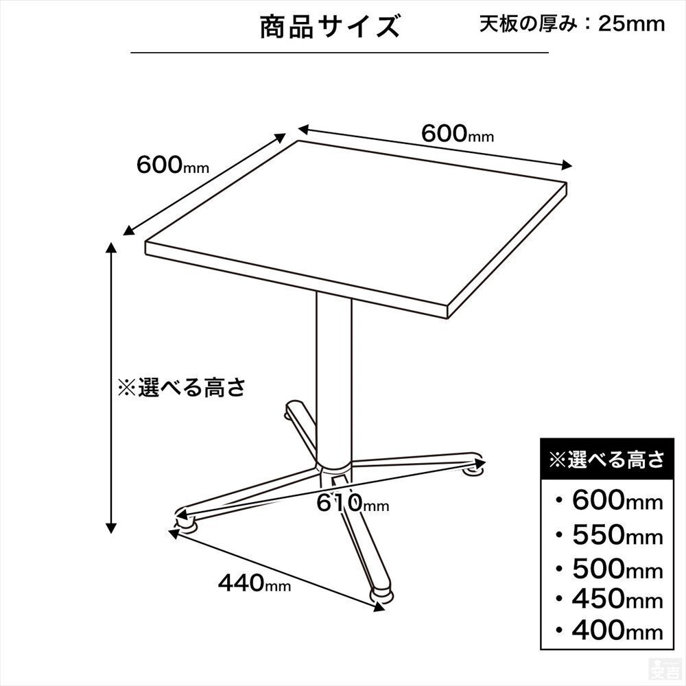 | 注意事項 | ・直射日光があたる場所は避けて設置して下さい。 ・ヒーター等、火気の近くには設置しないで下さい。 ・加熱した鍋や湯沸かし等を直接置かないで下さい。 ・テーブルに腰掛けたり、踏み台として使用したり天板に立ったりしないで下さい。 ・湿気の多い場所は避け、平面に設置してご使用下さい。 ・床面にキズがつかないよう設置場所にはご注意下さい。 ・テーブルに過度な荷重をかけないで下さい。 ・テーブルの上に物を乗せたまま移動しないで下さい。 ・移動させる場合には引きずらず、持ち上げた状態で移動させて下さい。 ・お手入れには薄めた中性洗剤を使用し、その後よく水拭き・乾拭きをして下さい。 ・アルコールやベンジン、磨き粉等は使用しないで下さい。 ・取り付けネジ部は定期的に点検をし、必要であれば増し締めを行って下さい。 ・椅子はイメージの為付属しません。レストランテーブルのみの販売となります。 |