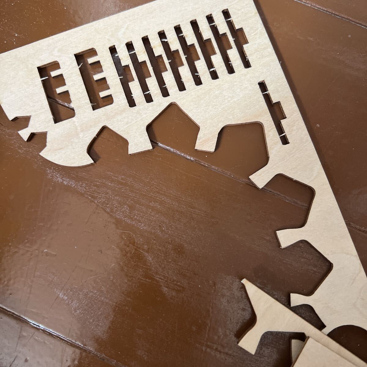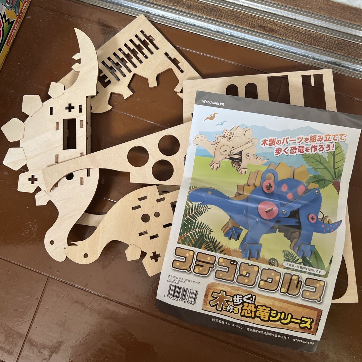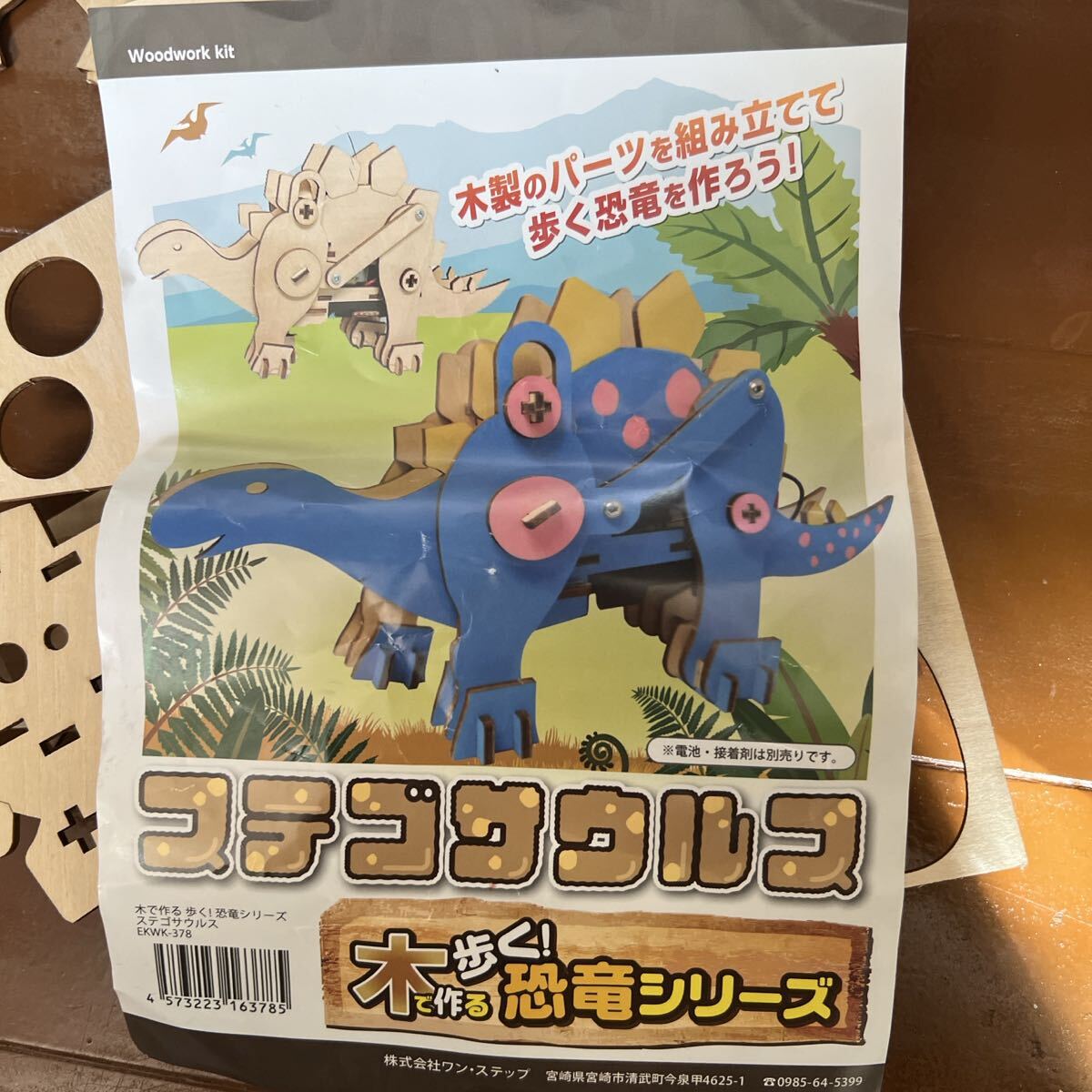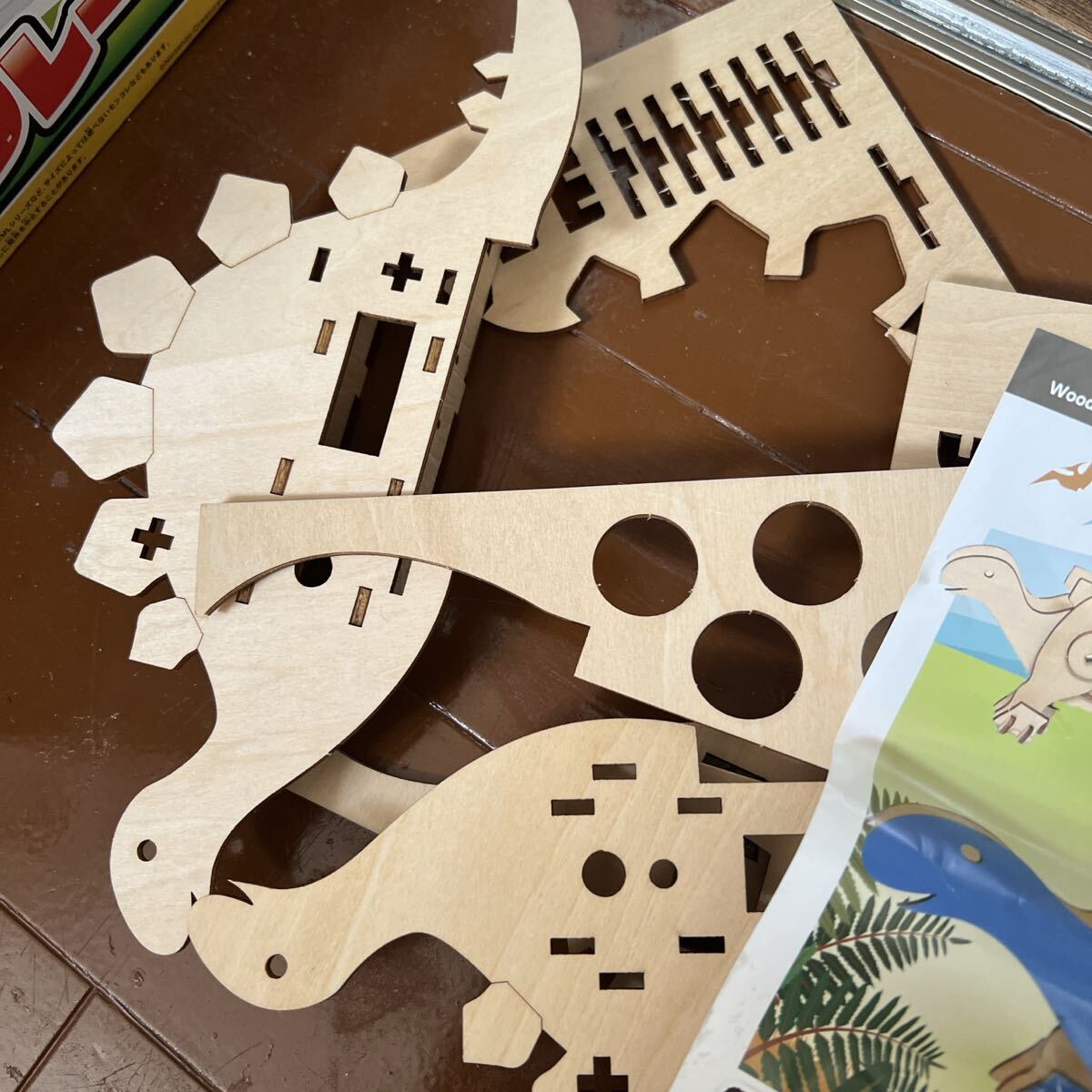 木製のパーツを組み立てて歩く恐竜を作るキットです。