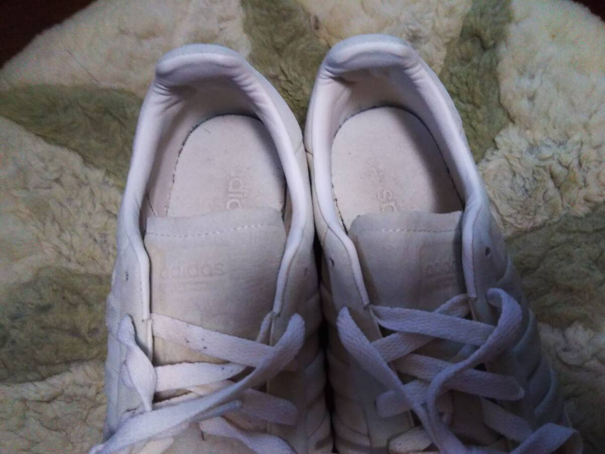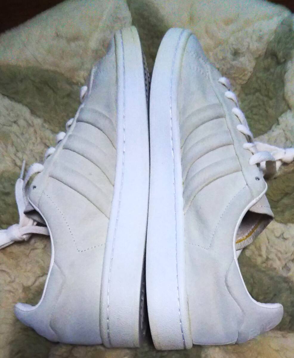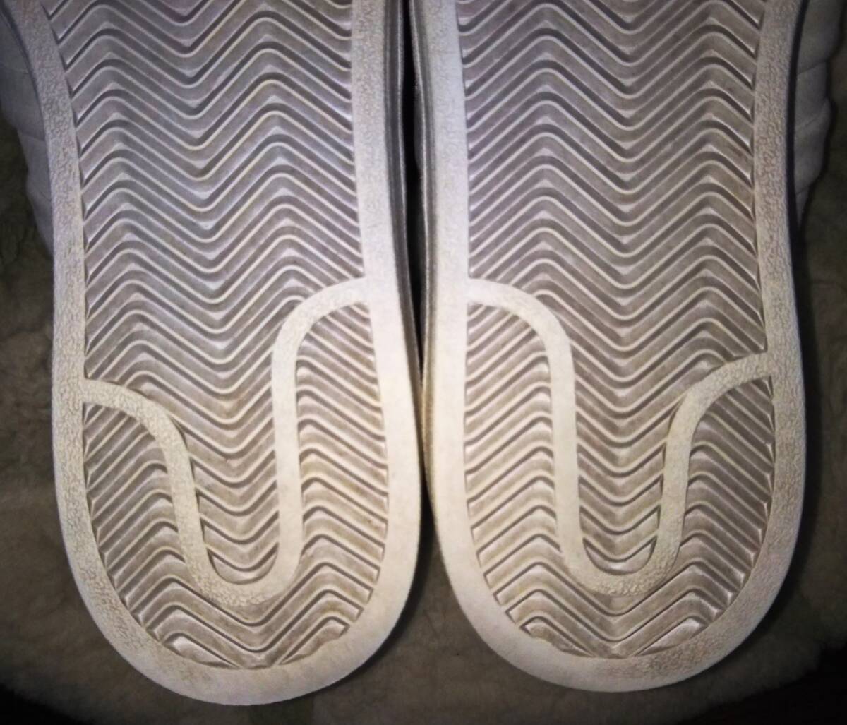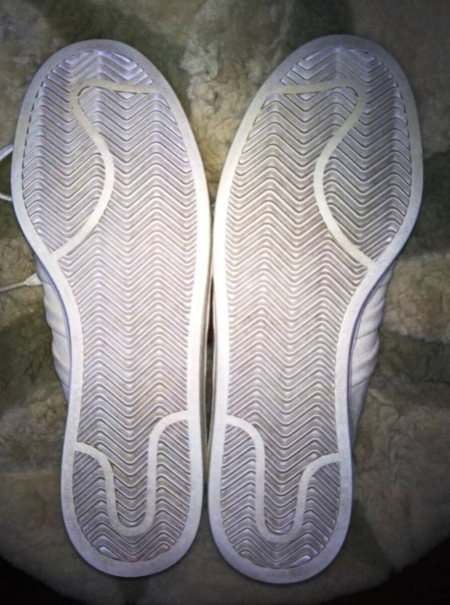 インソールに薄汚れ、左の甲辺り・3ラインに薄汚れ踵の減りありと使用感あるも、減りはごく少なく、酷い傷み・汚れない状態です。