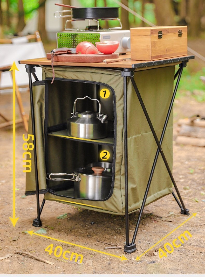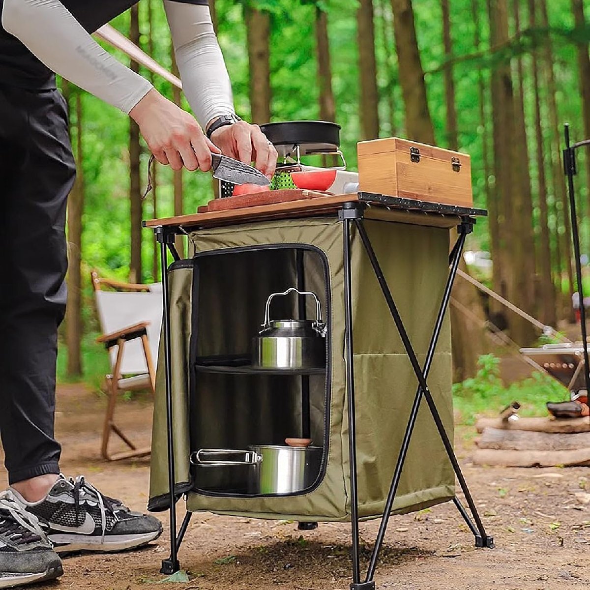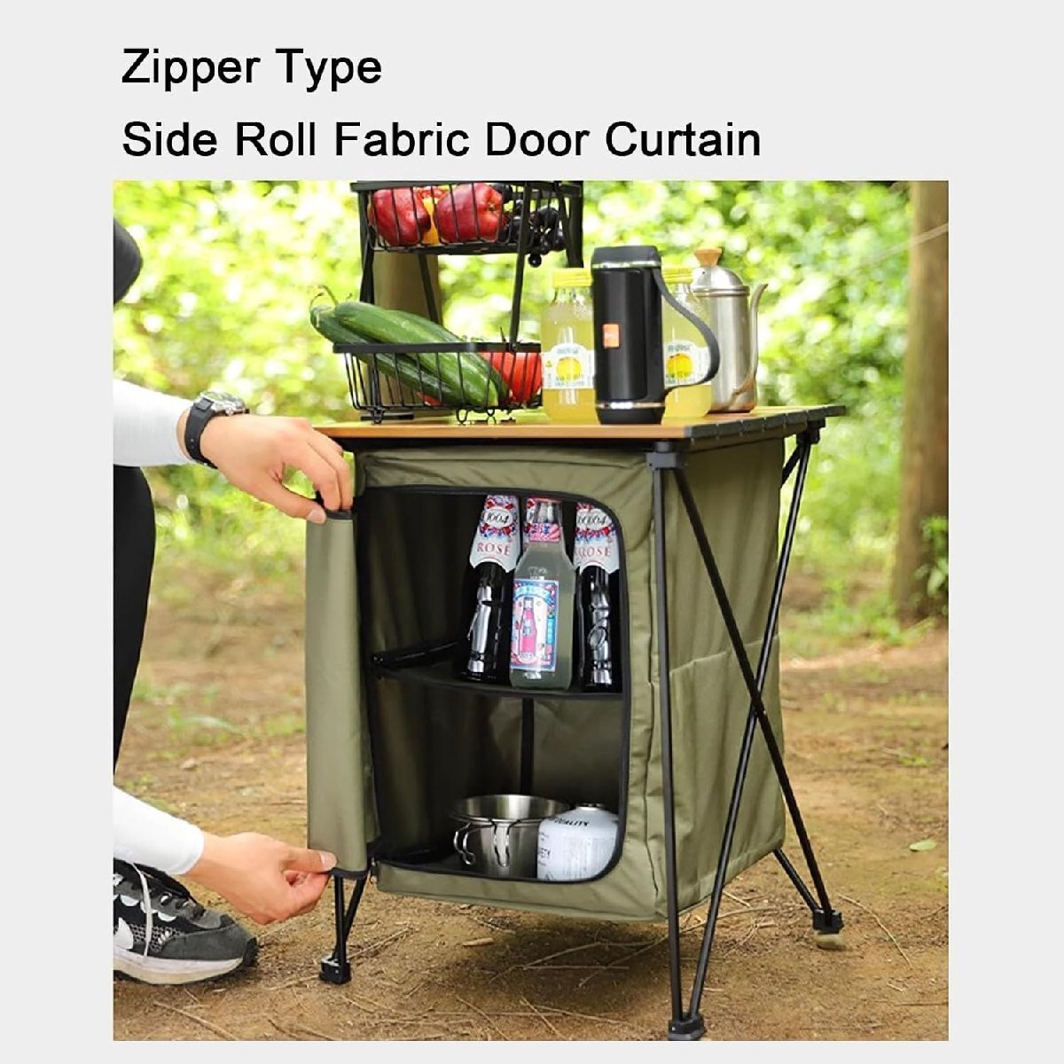 【持ち運びに便利】この屋外キャンプ食器棚にはジッパードアとメッシュポケットが付いており、キャンプアイテムに簡単にアクセスして整理できます。 折りたたみ式のデザインとトートバッグも付いており、保管や持ち運びが簡単です。