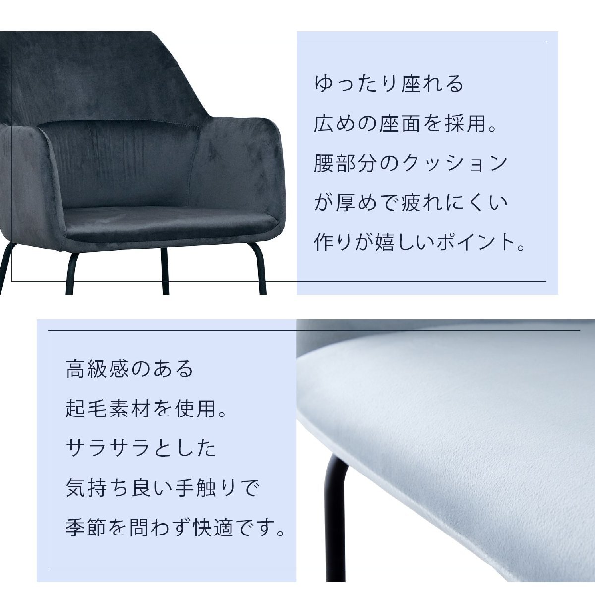 ・起毛感のあるモケット生地の座面は広めのゆったりサイズ。