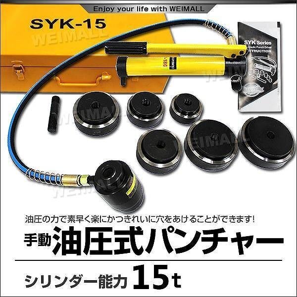 | ステンレス板や鉄板の穴あけに! 油圧の力で素早く楽にかつきれいに穴をあけることができます♪ 移動や保管に大変うれしいケース付きです! 【仕様】 ・油圧能力:15t ・シリンダストローク:25mm ・使用可能金属:ステンレス板・鉄板・アルミ板 など ・対応金属:ステンレス1.0mmまで 軟鋼鉄板4.0mmまで ・本体サイズ(約):340mm×55mm×130mm(閉じた状態)/335mm(開いた状態) ・ホース長さ(約):127cm ・ケースサイズ(約):460mm×230mm×155mm ・本体重量(約):6kg 【内容】 ・本体 ・ダイス(φ114、φ100、φ89、φ80、φ76、φ64) ・シャフト1本 ・英語版取扱説明書 (油圧工具 パンチャー 油圧 パンチャ パンチ ステンレス板 鉄板 穴あけ 工具 おすすめ 送料無料)