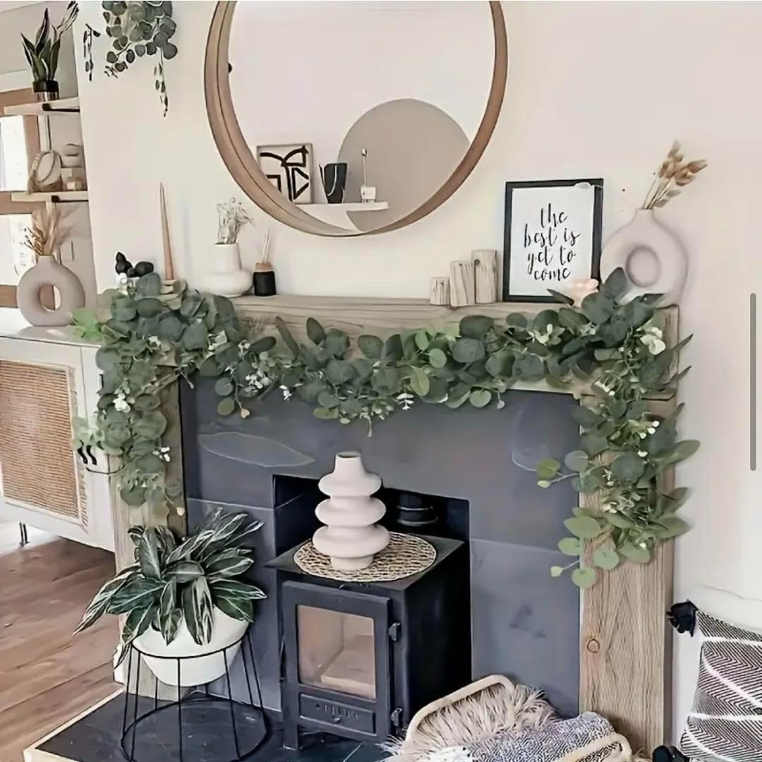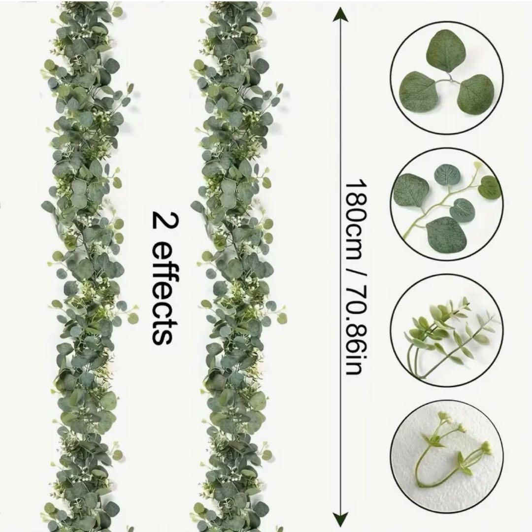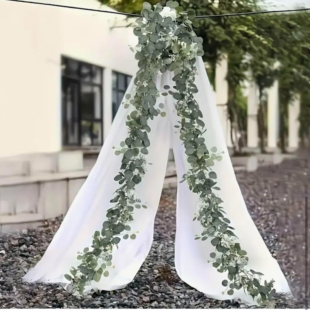 シルバードールユーカリの葉と白い花で装飾された人工緑です。