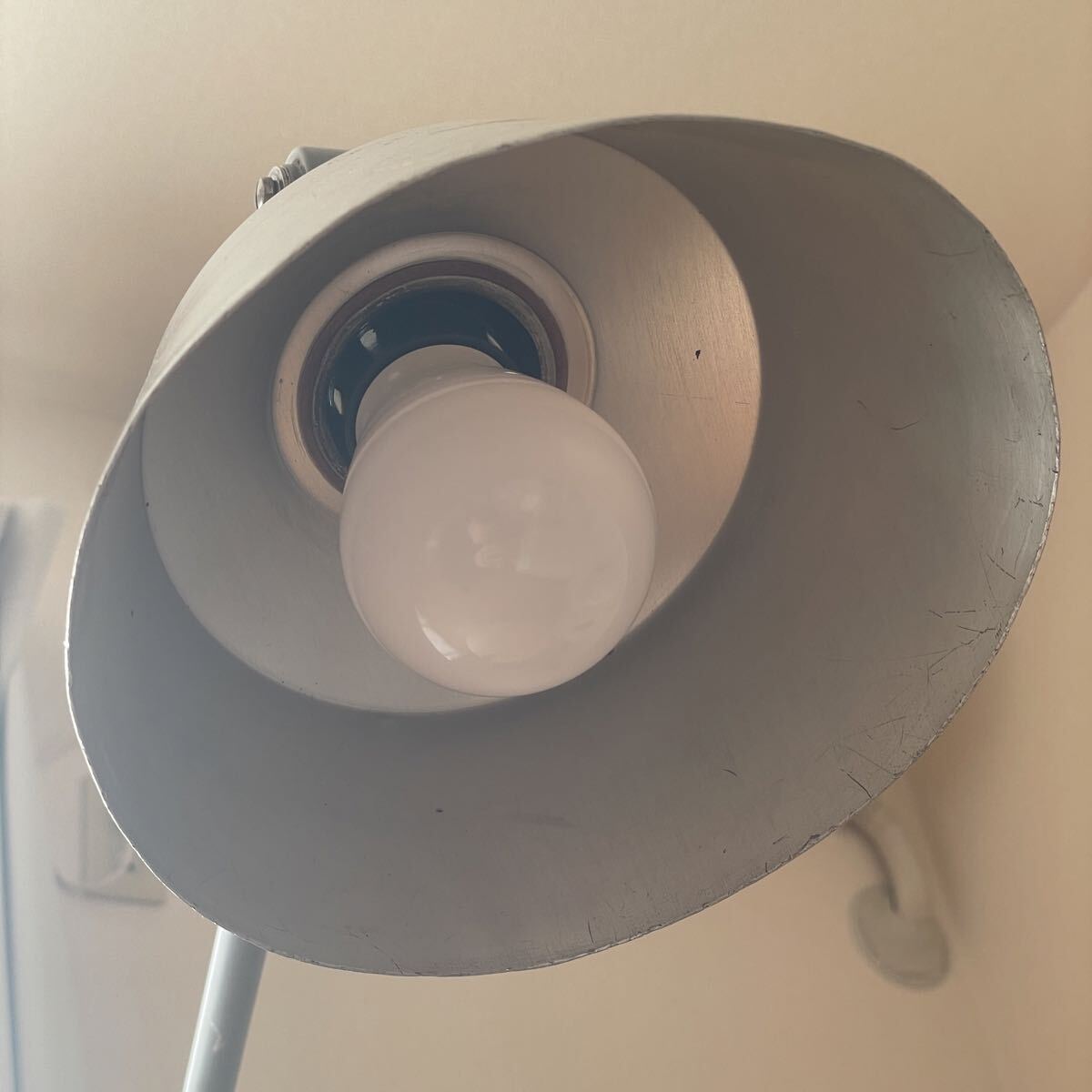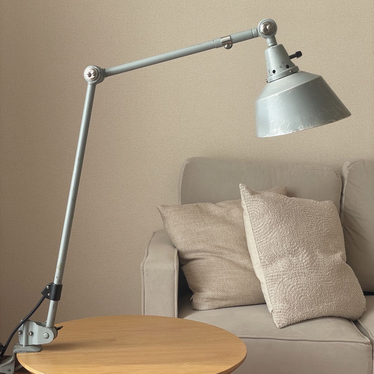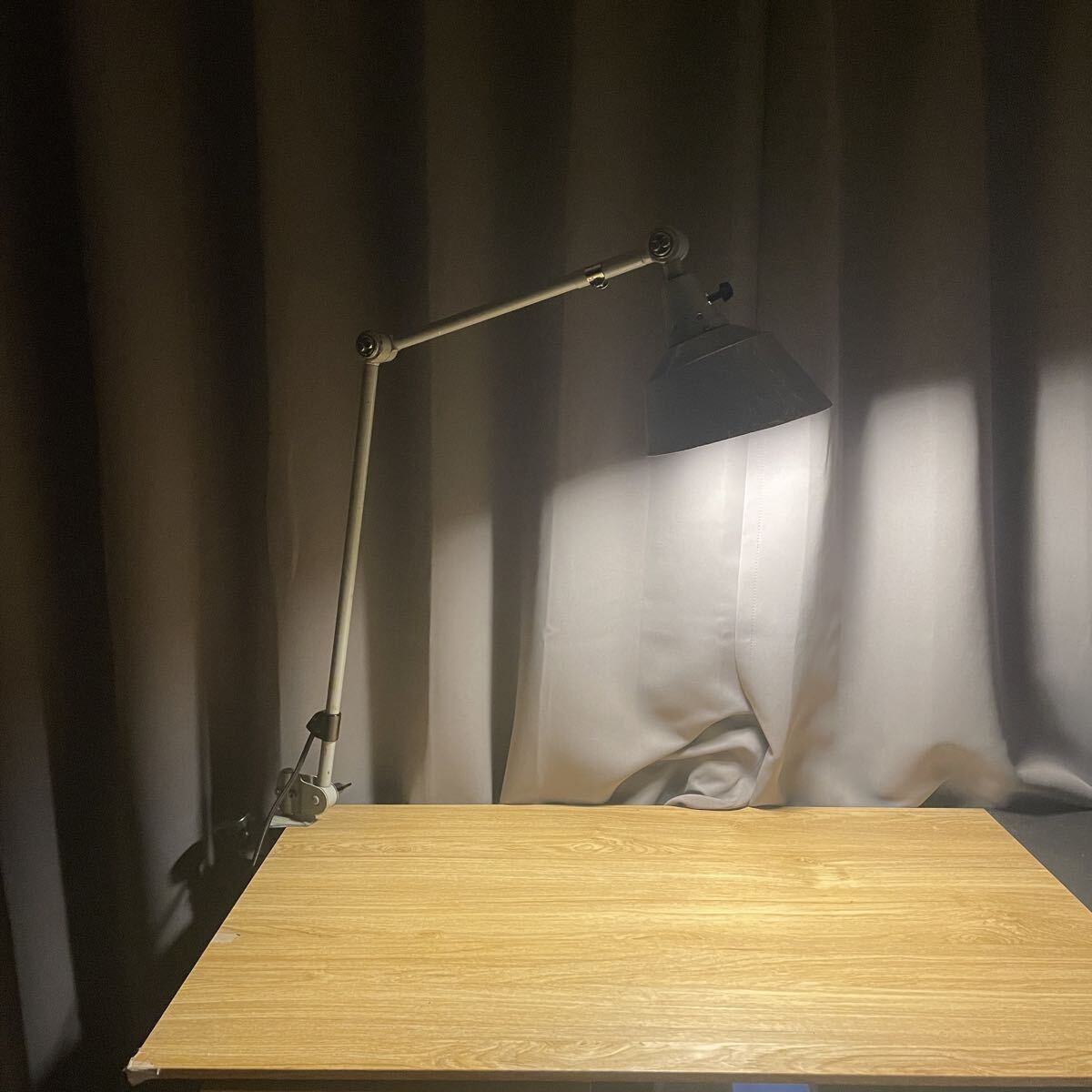 。デザイナーは Curt Fischer。1930-1940年近辺のものかと思います。本出品のような比較的初期のものは海外でも人気で最近はほとんど見かけなくなってきました。ポールはスチール。リフレクターはアルミです。ペイントはリペイントされており、コードも新しいものに交換してありますので、安心してご利用いただけるかと思います。アームが長く迫力があります。クランプが着いておりますのでデスクに簡単に取り付けられます。