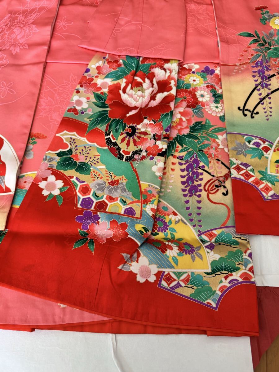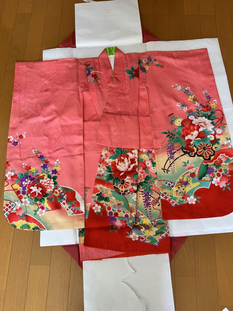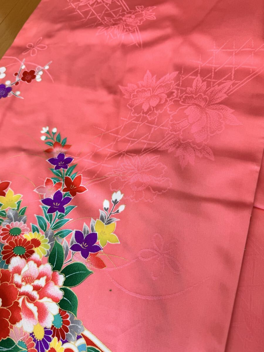 七五三用 7歳用の四つ身 ピンク色 正絹 長襦袢付き 肩上げ、腰上げの補正をしていますので、サイズが合えばすぐにご使用いただけます。