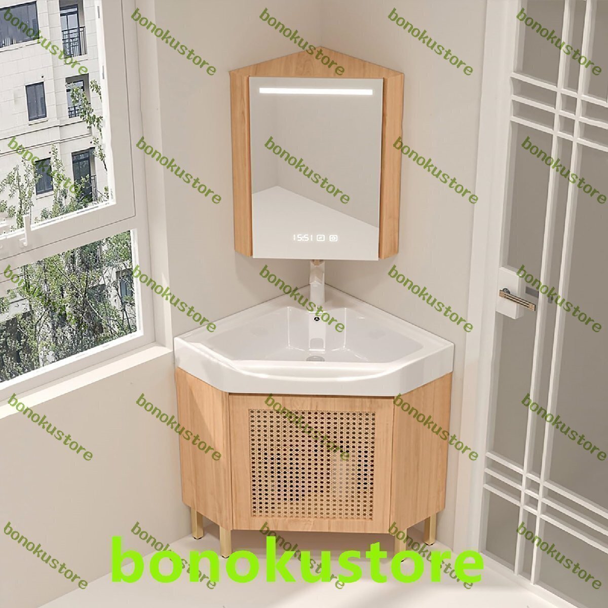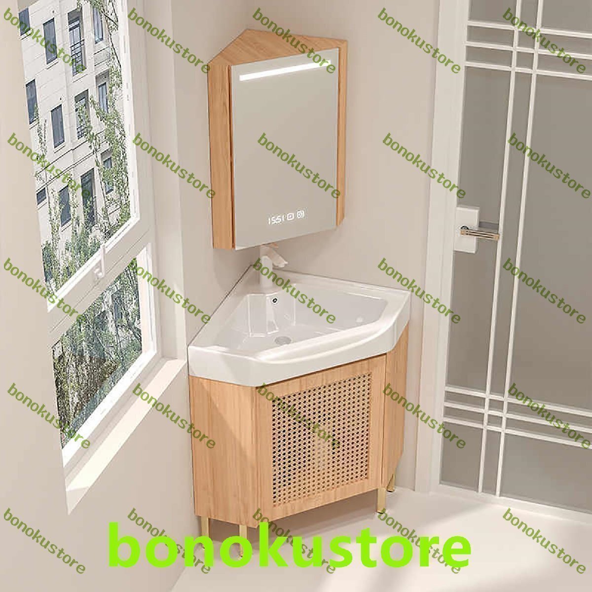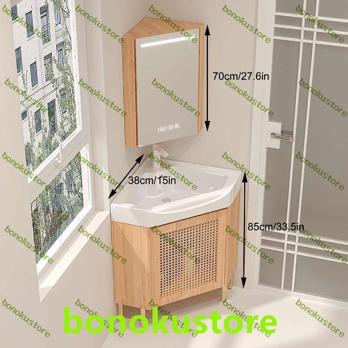 ??モダンな洗面化粧台シンクは、シンプルでエレガントなデザインと耐久性のある構造が特徴です。これらの細くてコンパクトな洗面化粧台は、小~中規模のバスルーム、ハーフバス、狭いスペースなどに最適です。特徴:- 床置きの三角形のコーナーデザインはスペースを節約し、狭いスペースに最適です。- 多層の無垢材ボードで作られたこのキャビネットは、防水性と防錆性を備えています。- 収納キャビネットはミラーキャビネットの後ろにあり、十分な収納スペースを提供します。- 高温焼成の一体型セラミックポットは、耐久性があり、お手入れが簡単です。- オーバーフローポートとその周りの湾曲したデザインにより、排水が妨げられません。仕様:製品名: ユーティリティコーナーバスルーム洗面台コンボ色: ホワイト、ウッドカラーミラーキャビネットサイズ: 70cm/27.6インチバスルームシンクキャビネットサイズ: 38cm/15インチシンク素材: セラミック洗面台キャビネット素材: 無垢材多層ボード機能: 収納、洗浄、防水、照明、曇り止め表面技術: 無塗装パッケージ内容:温水・冷水蛇口 x 1コーナーバスルーム洗面台 x 1