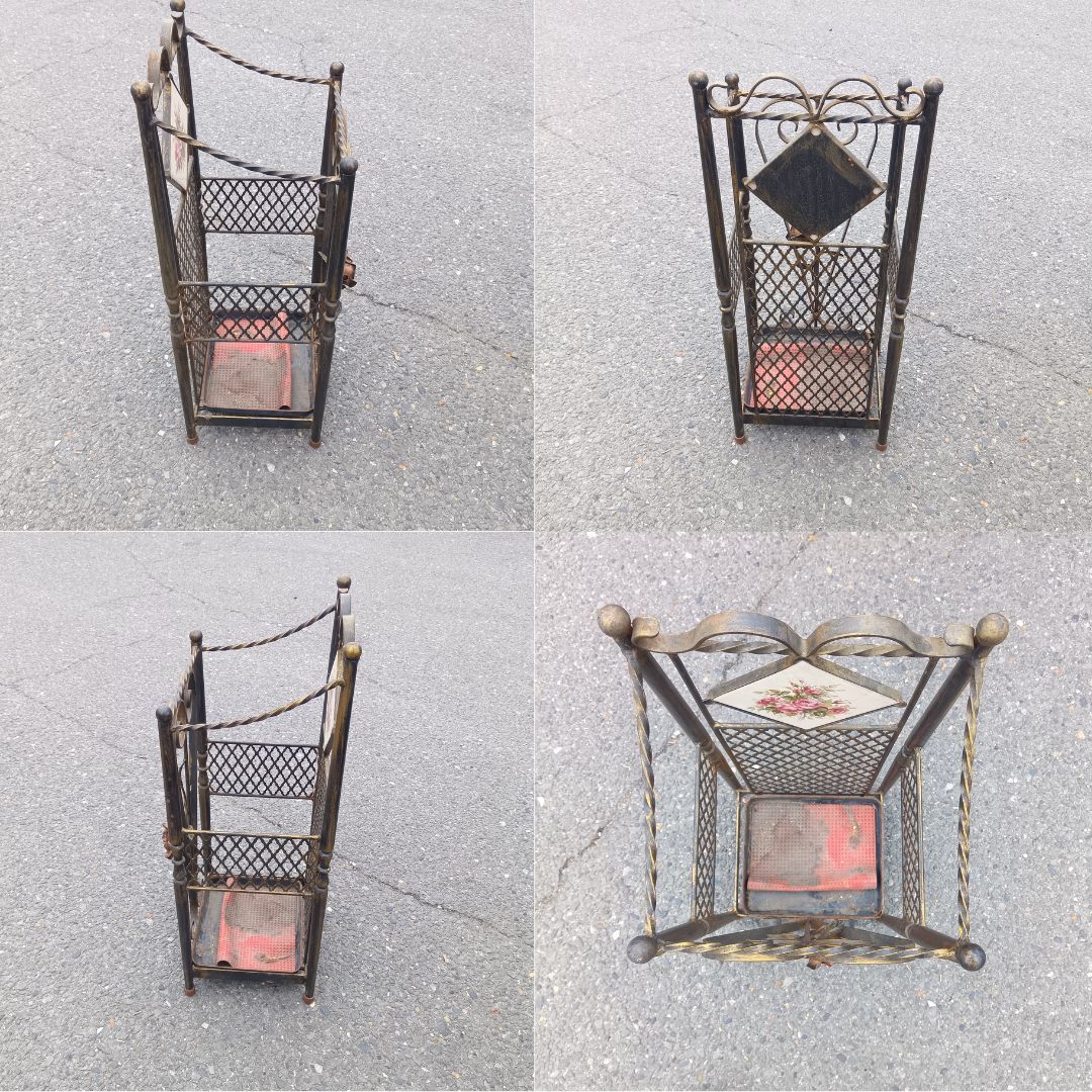ヨーロッパの雰囲気を纏う、アイアン製のアンブレラスタンド(傘立て)です。細部のデザインまでこだわり抜かれたロートアイアン風の装飾が、玄関先に優雅な彩りを添えます。特に目を引くのは、背面上部に埋め込まれた**可憐な薔薇(ローズ)柄の陶器タイル**です。このタイルが、重厚なアイアンに優雅さと華やかさをプラスしています。曲線を描くフレームワークと、金色のアクセントカラーが施されたアンティーク調の仕上げは、クラシカルなインテリアやシャビーシックなお部屋にもぴったりです。日々の生活に欠かせない傘立てでありながら、まるでオブジェのような存在感を放ちます。来客時にも目を惹く、エレガントな一品です。