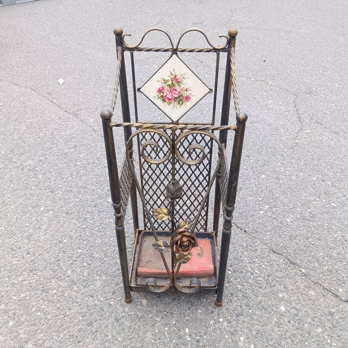 玄関に置くだけで、まるでヨーロッパの邸宅のようなエレガントな雰囲気を演出できます。重厚感のあるアイアンと美しい薔薇のタイルが、雨の日もお客様を優雅にお迎えする、そんな喜びを感じさせてくれます。