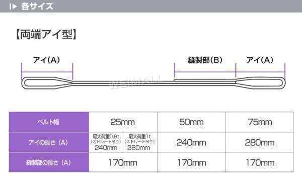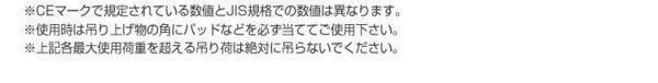 ヨーロッパの工業規格である「CEマーク」を取得したスリングベルトです。 強度・弾性・耐久性・防腐性に優れている繊維の詰まったポリエステル素材のベルトで、あらゆる吊り荷をマルチにやさしく包み込み、安全に吊り上げます。 建築・造園・造船・荷役業など、さまざまな現場で大活躍! 【商品仕様】 全長:3m ベルト幅:25mm 最大使用荷重(能力) ・ストレート吊り:1000kg ・チョーク吊り:800kg ・バスケット吊り:2000kg 材質:ポリエステル100% 両端アイ型 CE規格品 【商品内容】 スリングベルト × 10 ★★その他ラインナップ★★ 1本 / 10本セット / その他 【注意事項】 ・上記各最大使用荷重を超える吊り荷は絶対に吊らないようにお願いいたします。 ・使用時は吊り上げ物の角にパッドなどを必ず当ててご使用ください。 ・繊維製品ですので寸法に多少の誤差があります。ご了承ください。 |