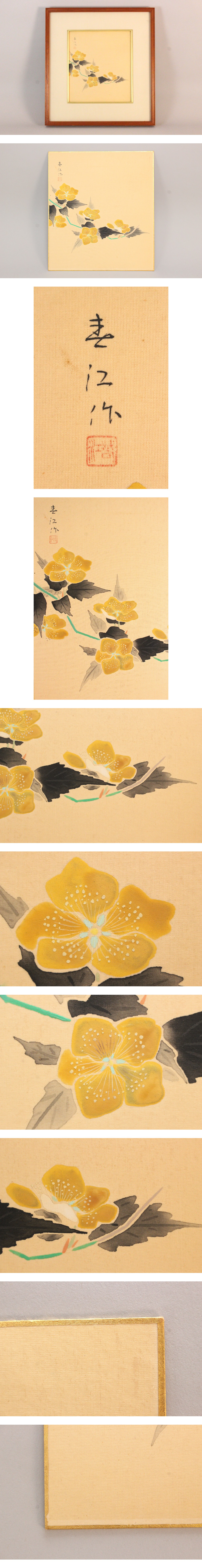 [1643140]【真作】望月春江 山吹図 日本画 絹本色紙 額装◆花鳥画巨匠/山梨県生/結城素明師事/日本芸術院賞/日展参与/古画/古美術/うぶ品
