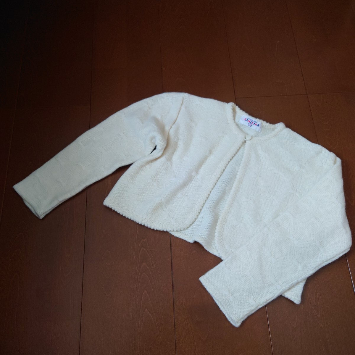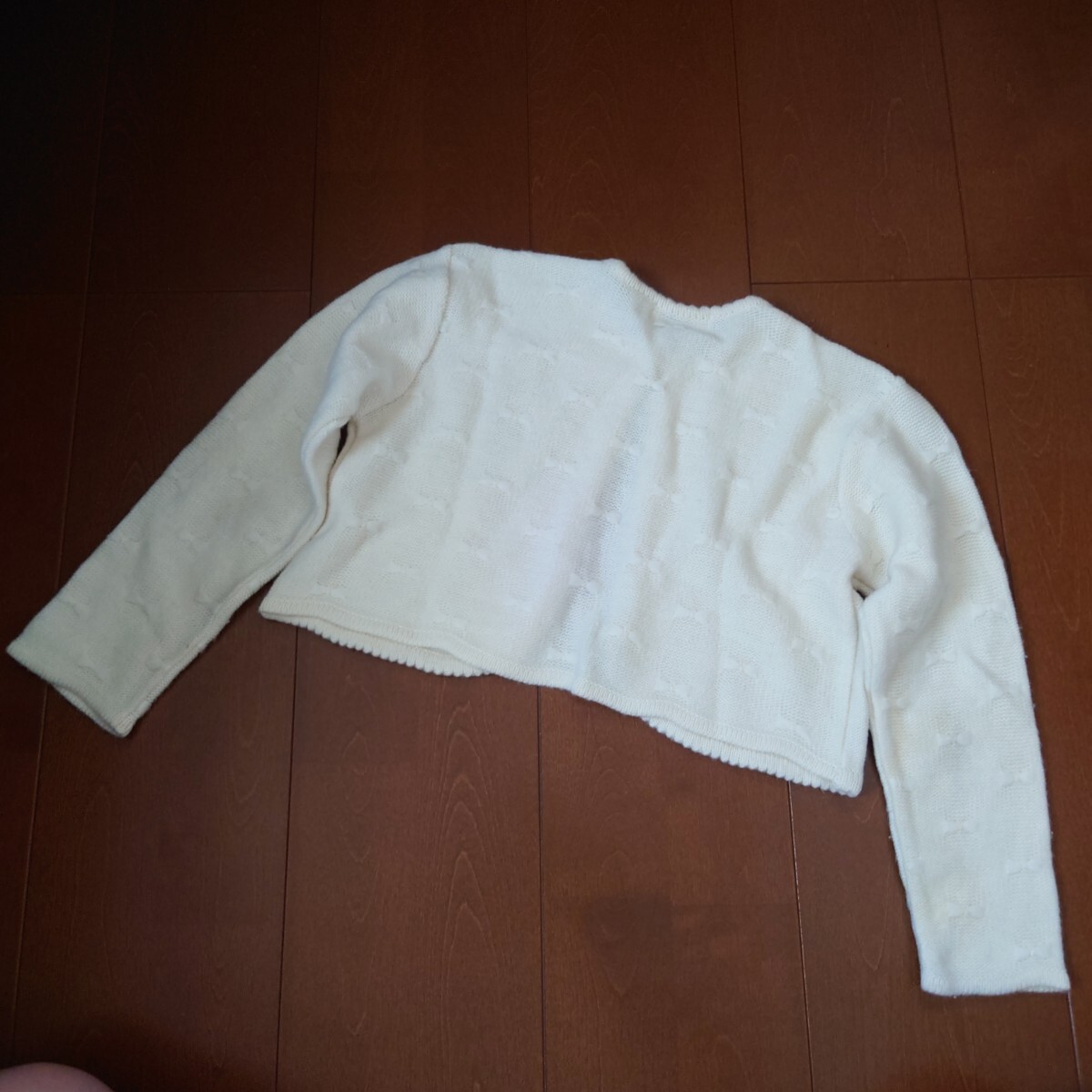 アイボリーのボタン付きニットカーディガン、120cmサイズ。