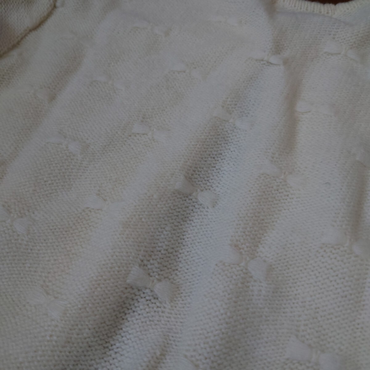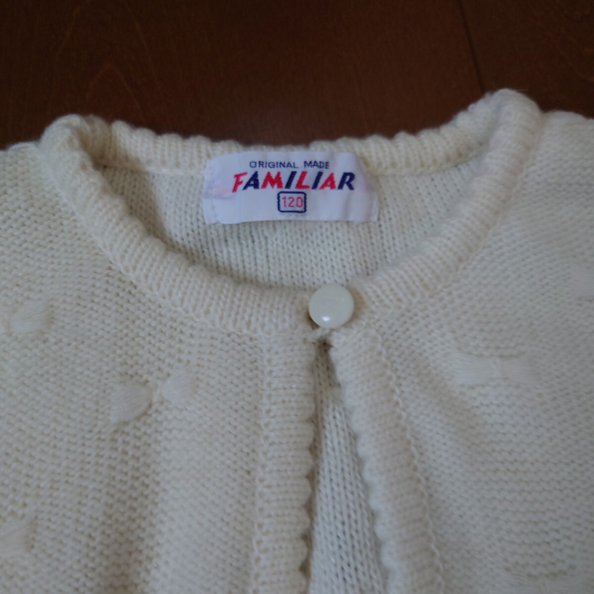 アイボリーのボタン付きニットカーディガン、120cmサイズ。