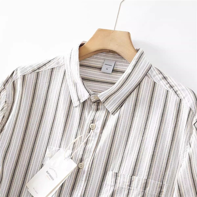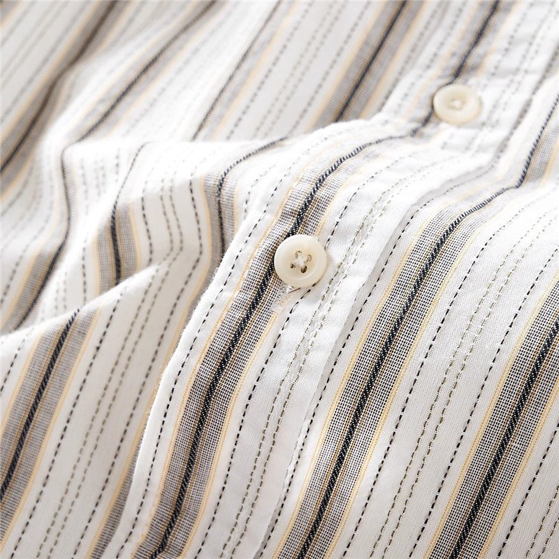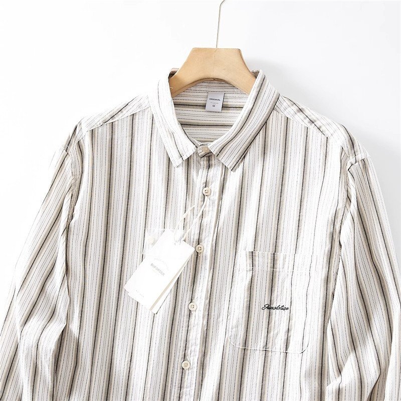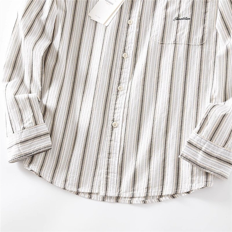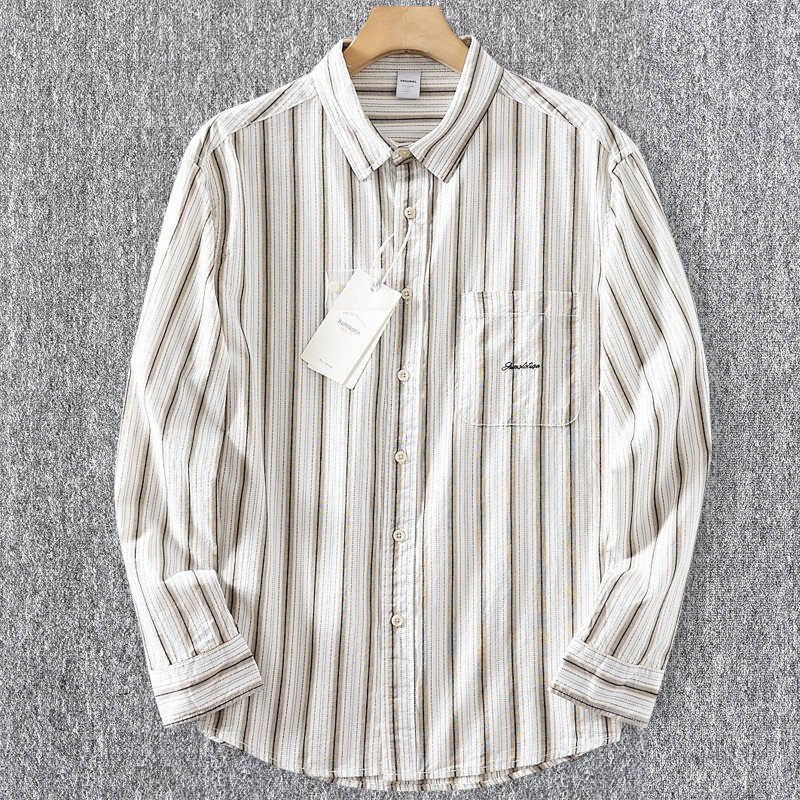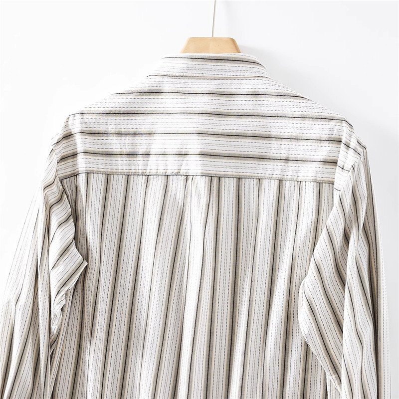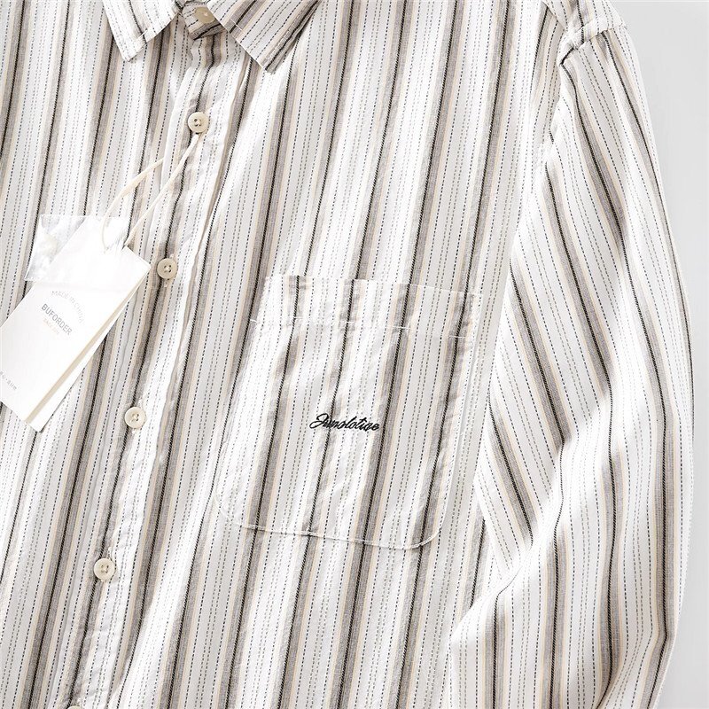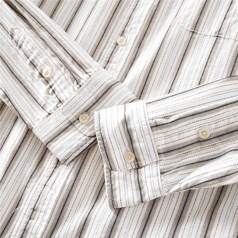 新品 DCKMANY シャツ長袖 サマー メンズ ストライプ ヴィンテージ 胸ポケット ウォッシュドコットン春夏 カジュアル/ カーキT6037-XL