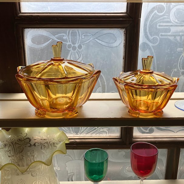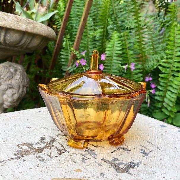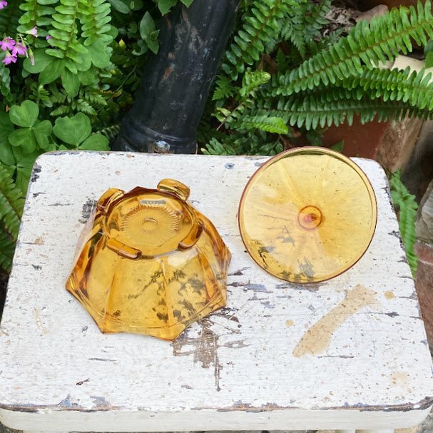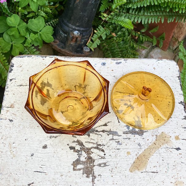 琥珀色のガラスがきらめくプレスガラスの容器が届きました。アールデコ調のデザインが目を引くお品です。推定1960年代。こちらはトリンケットセットと呼ばれるドレッサーに置いて使用するセットの中の一つとなります。