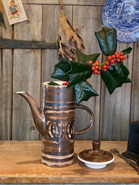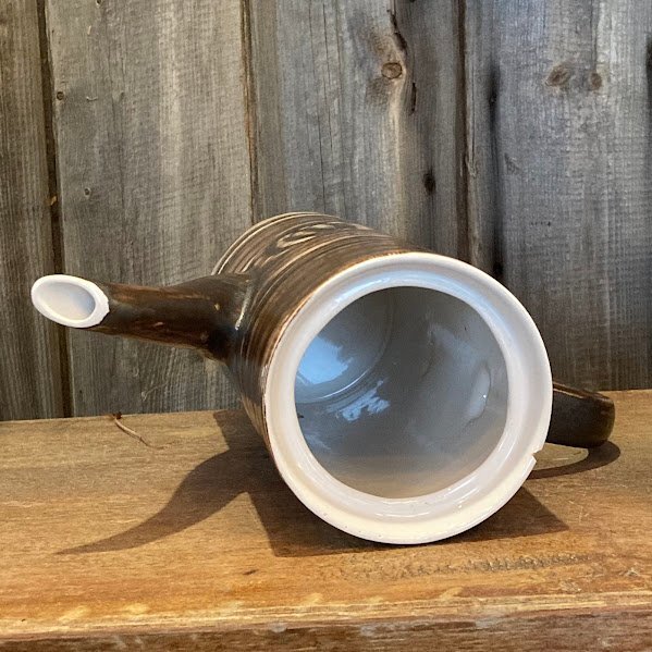 素朴なたたずまいのコーヒーポットが届きました【43-314B】イギリスではなじみのある細長い形のポットです。この形状から花瓶として使う方も多いですよ。1956年にデビット・シャープとジョージ・グレイで創立。1980年代まで多くの製品で成功を収めましたが惜しまれつつ2007年に閉鎖されました。こちらのシリーズは欧州で人気がありコレクター間で高く評価されているそいうです。1960年代、イギリス製。持ち手の上にあるフチに4㎜ほどのカケがあるので価格に反映させてあります。福岡市南区の店舗にてお渡しもできますのでお気軽にどうぞ!