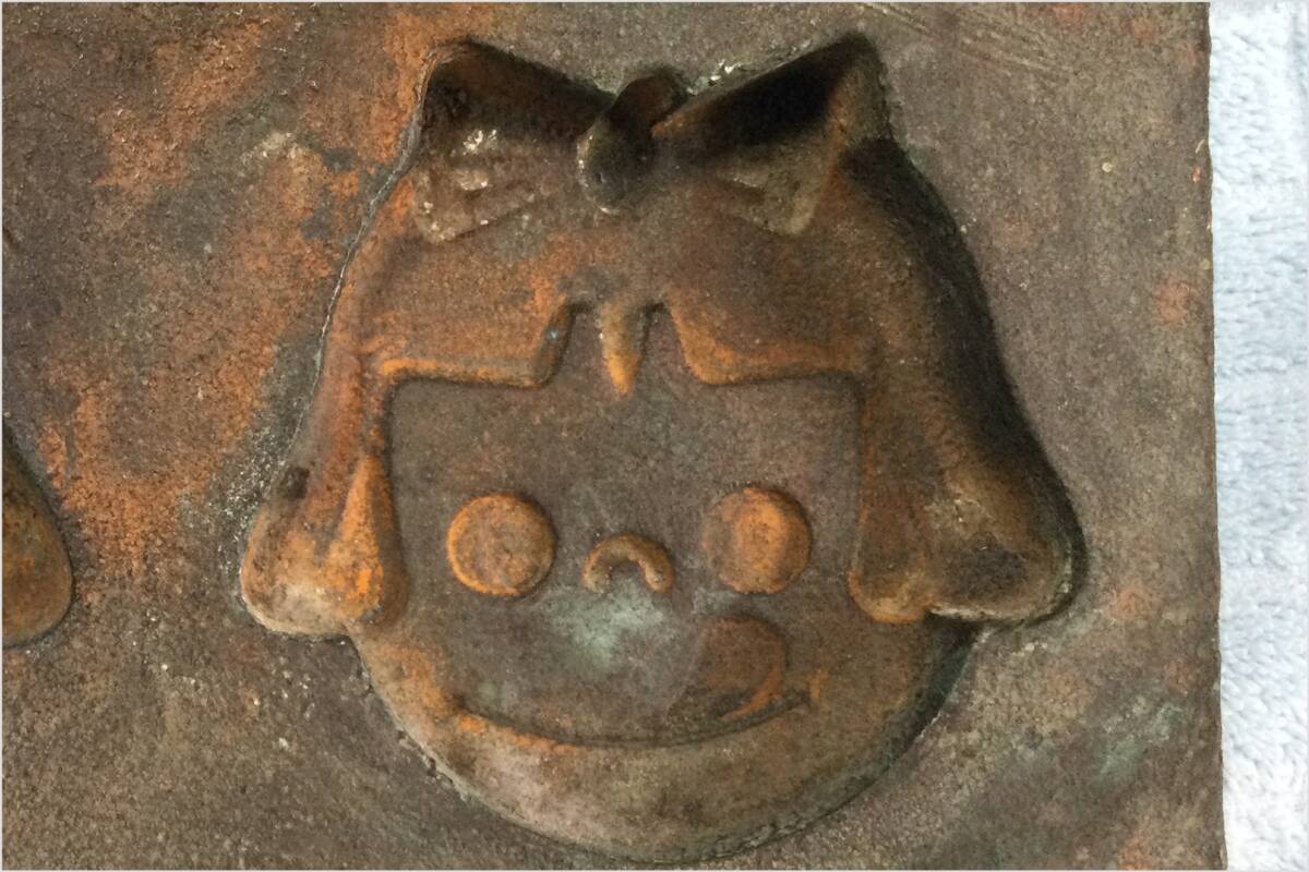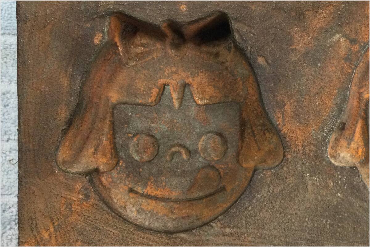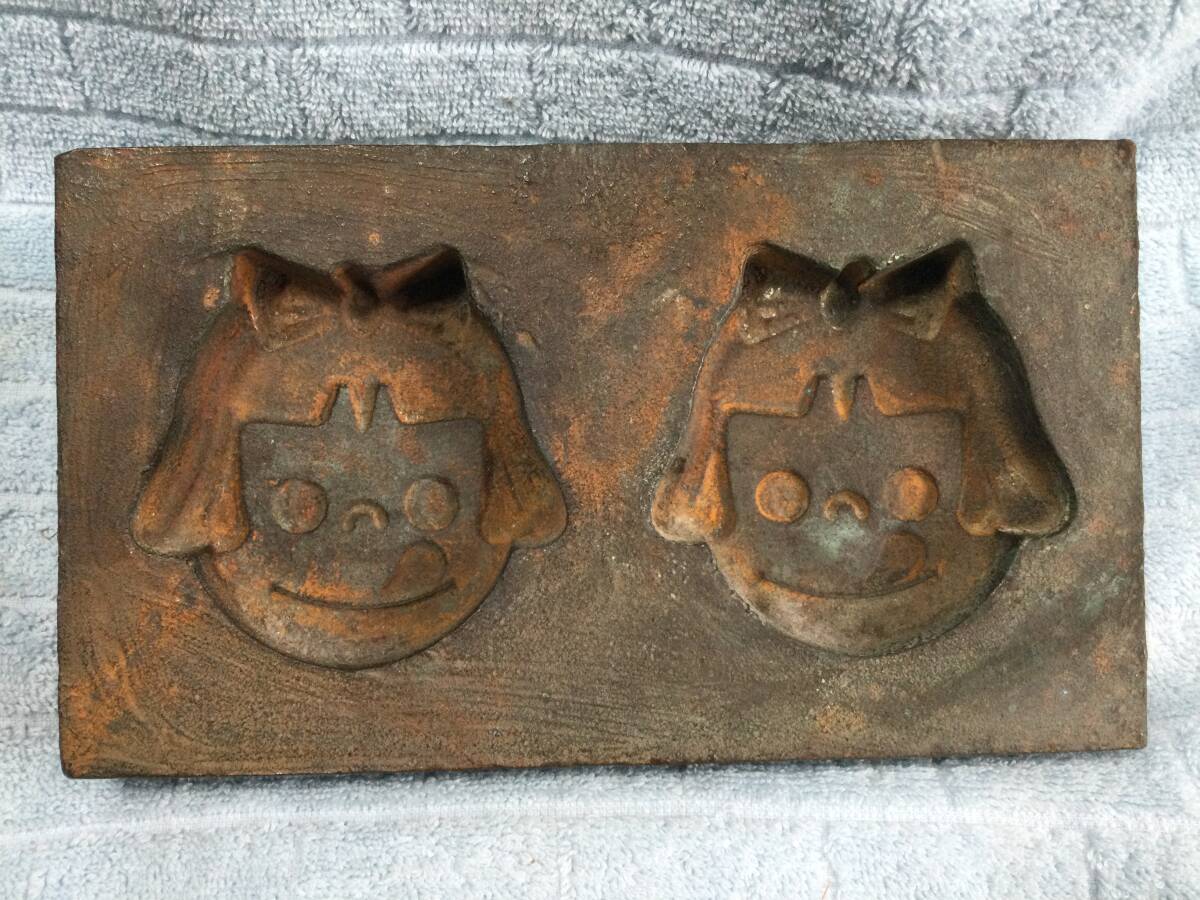 *当方専門外で年代等詳細解り兼ねますが、舌をペロッと出しているぺこちゃん?の金型か?。特筆すべきは、サイズから想像出来ない5.7 ㌔超の重量が有る事です。マグネットの着かない非鉄金属で砲金、真鍮、合金?は特定不可です、130×225×30㍉位。以上私感です画像での判断に成ります宜しく。ゆうパック60サイズ発送。