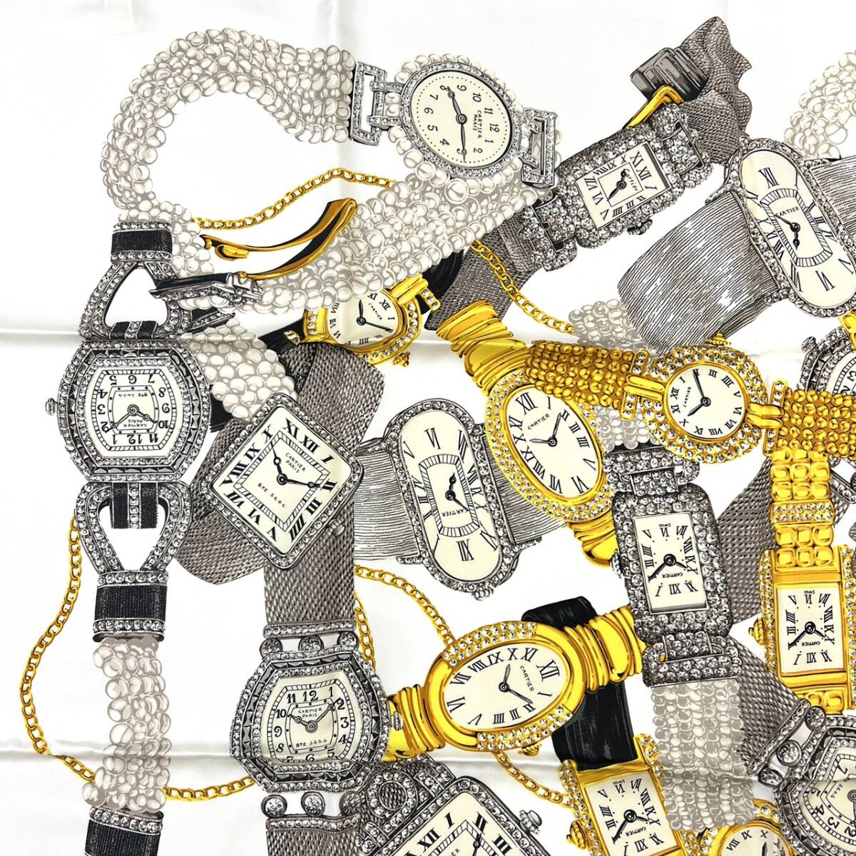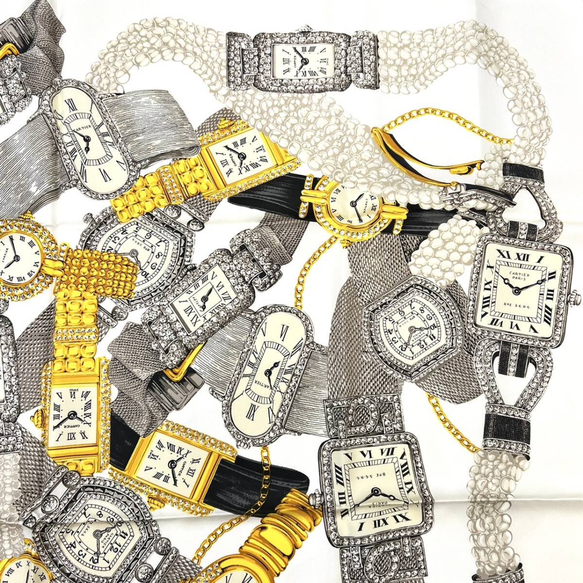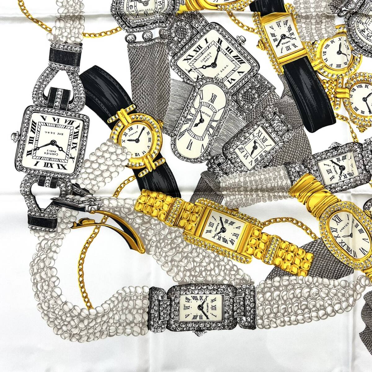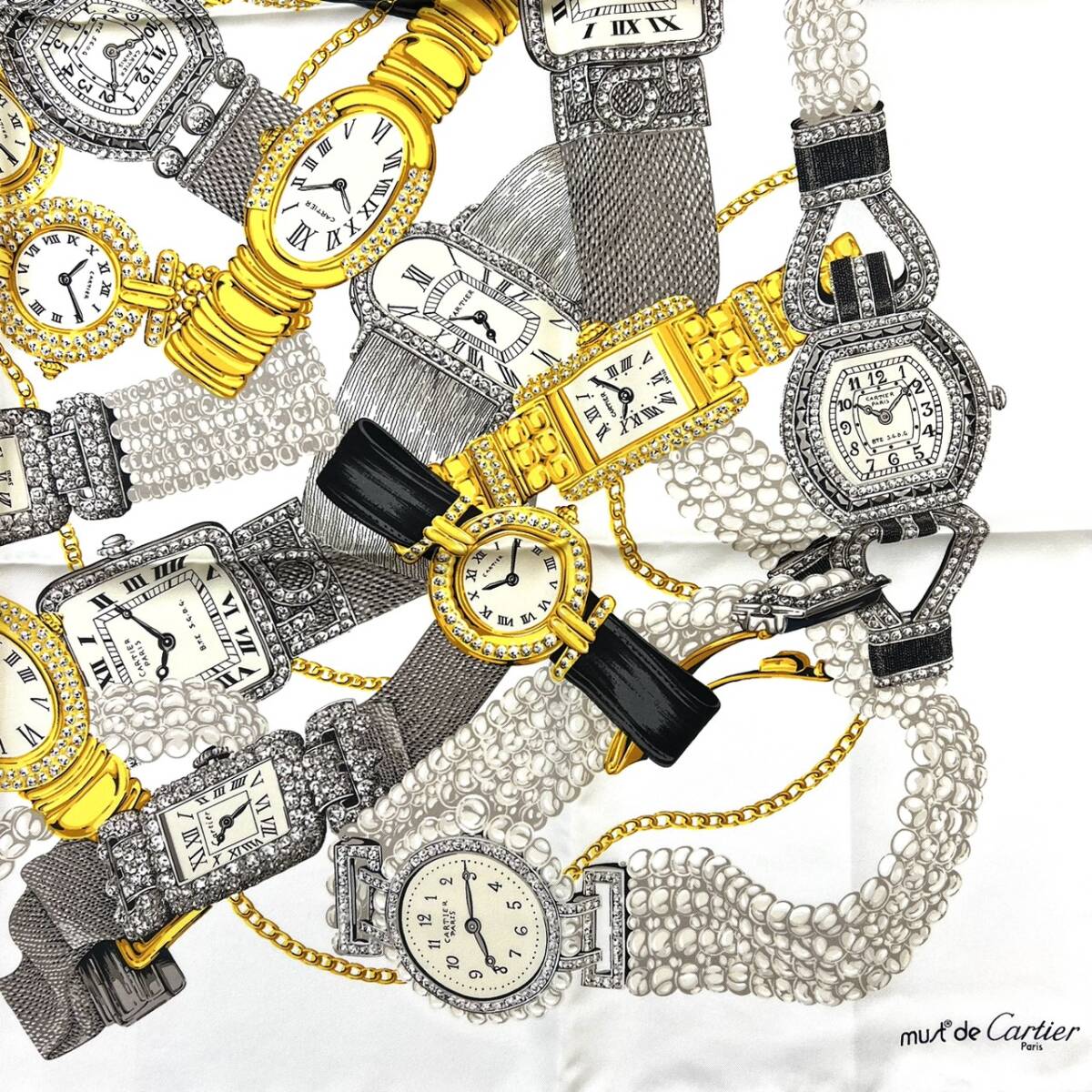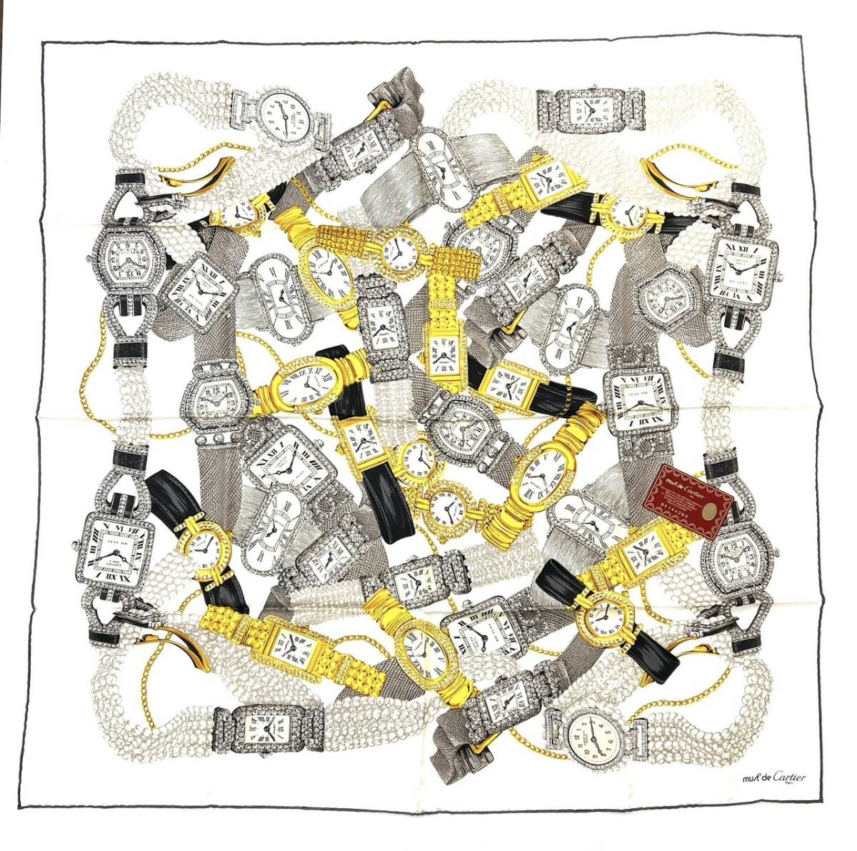 | 商品名 | ■ Cartier カルティエ チェーン 時計 腕時計 タンク ベニュワール パール モチーフ スカーフ 総柄 シルク 100% 大判 クリーム ギャラ 付 |