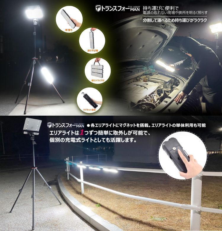 | 部品規格 | (1)ライト部:約W303*H61*D303mm | セット内容 | エリアライト付き台座、三脚(軸と脚*3本)、ACアダプター、Micro USBケーブル、固定金具*3、ストラップ、砂袋、 取扱説明書 、保証書、収納ケース |