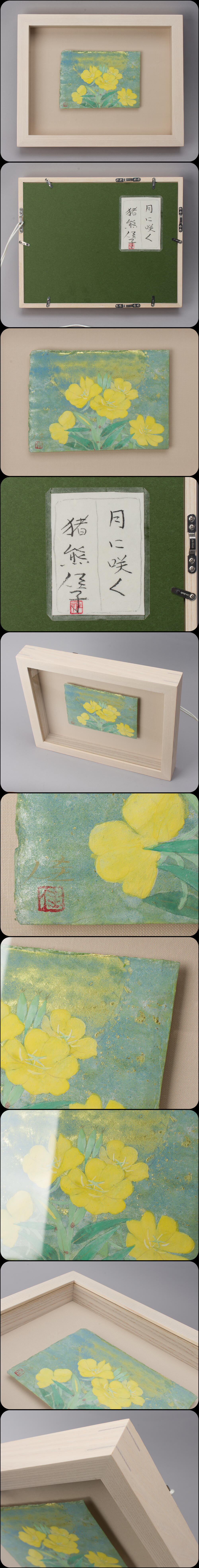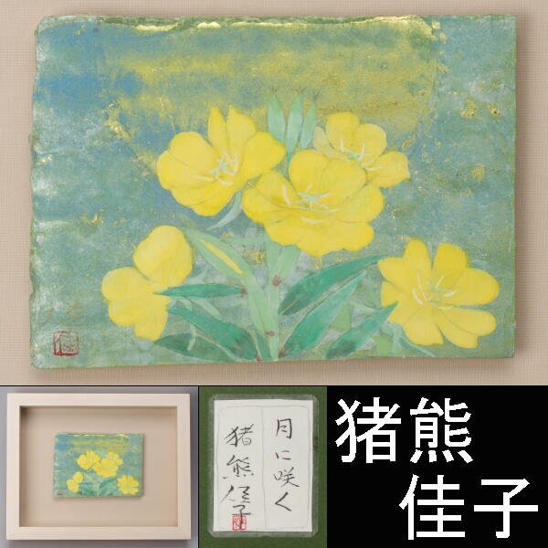 | 猪熊佳子、「月に咲く」。共シールあり。真作保証。紙本肉筆。 画面サイズは、約16.5x11.5-12cm。 ガラス上からの採寸ですので多少の誤差はあると思います。 額のサイズは約34x27cm。 額はガラス入りです。 額・画面とも、状態は良好です。 |