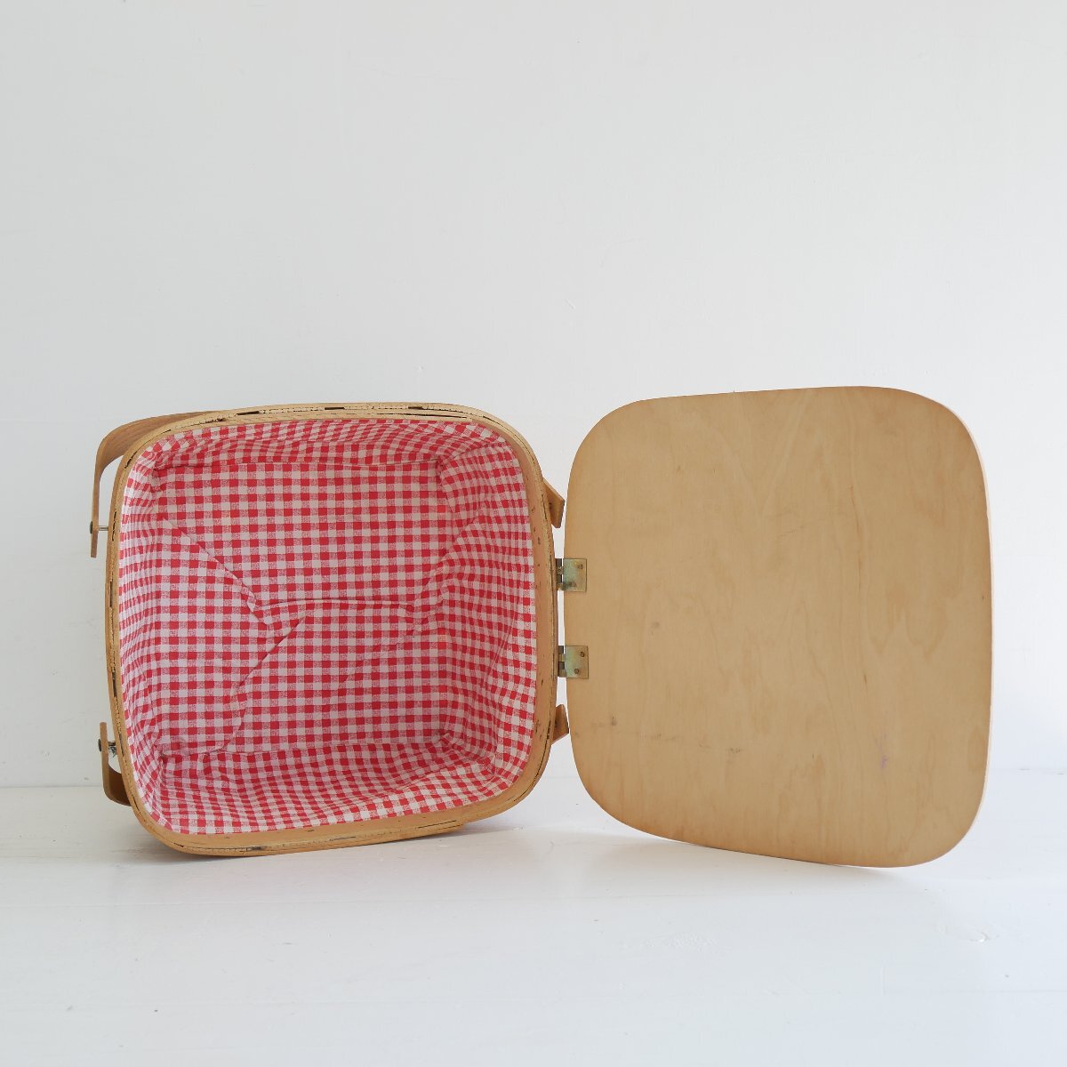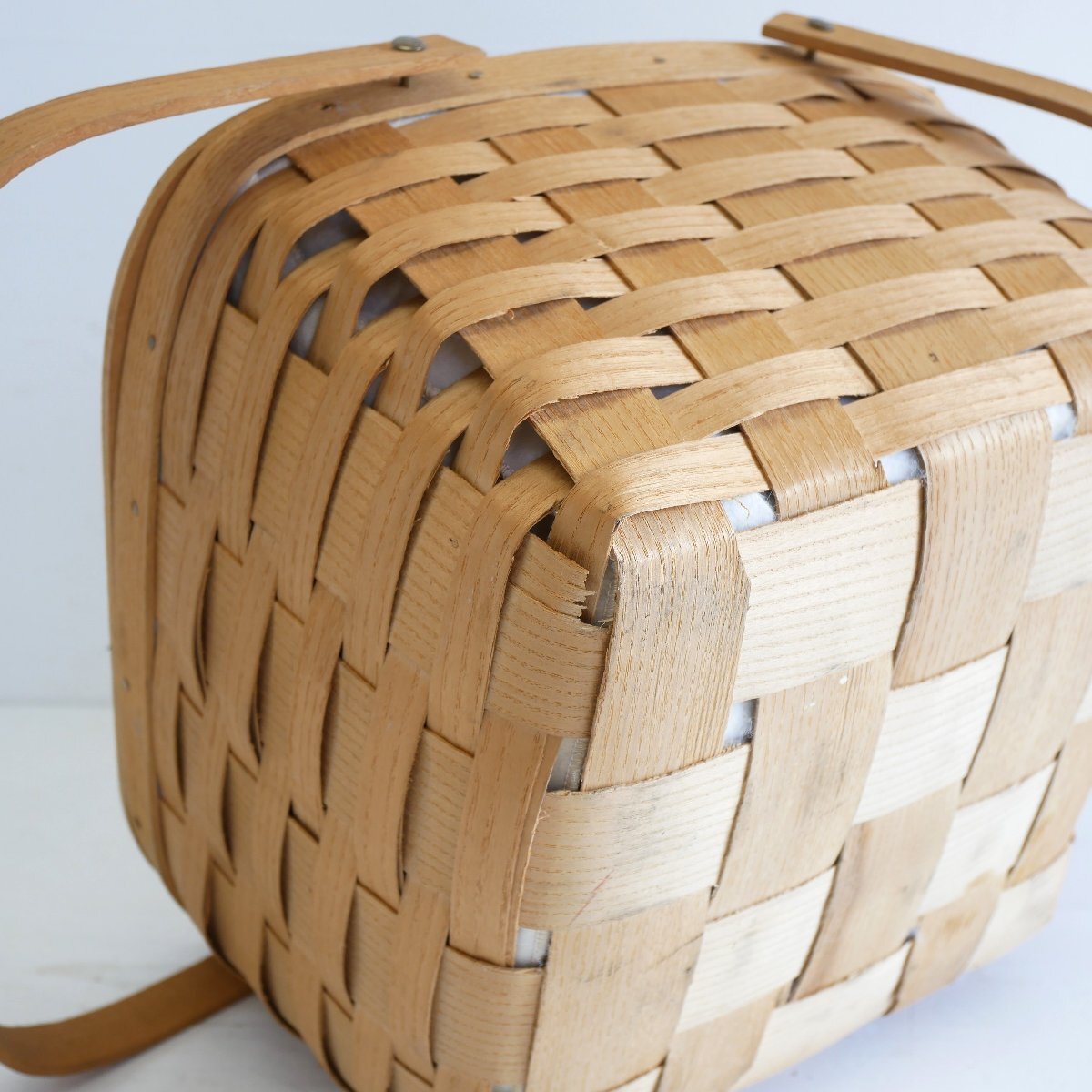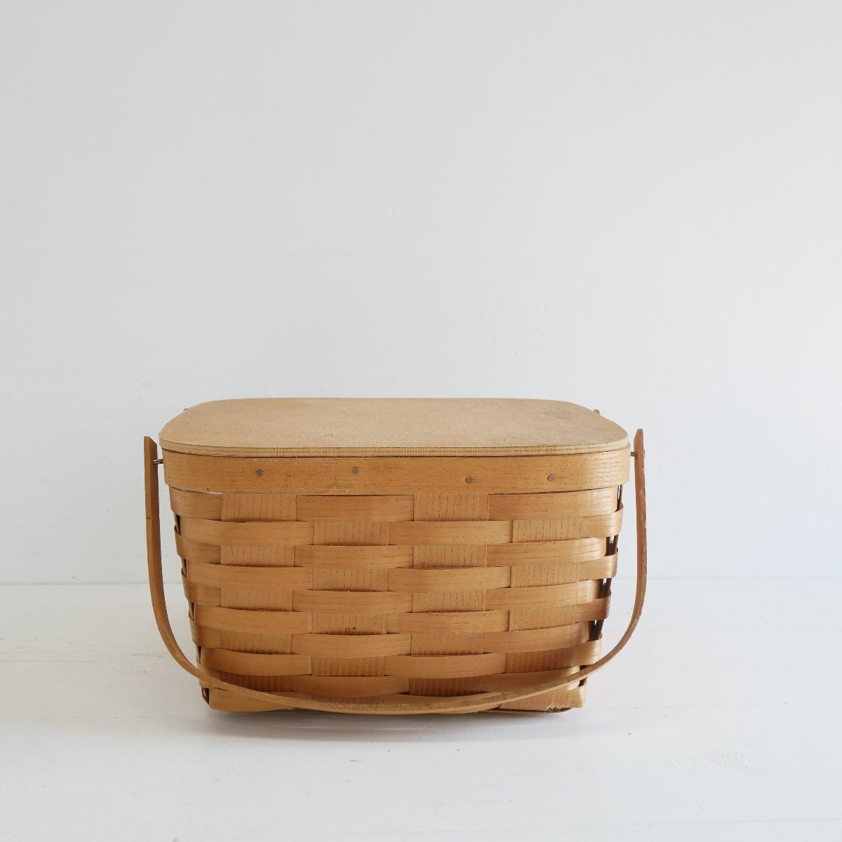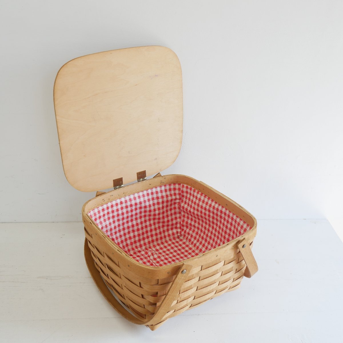| 商品説明 explanation | アメリカの田舎町で見つけたピクニックバスケットです。 カントリーテイストで、素朴でお洒落です。 お部屋のインテリアにいかがでしょうか。 材質 : 木の皮、木、ビニール |