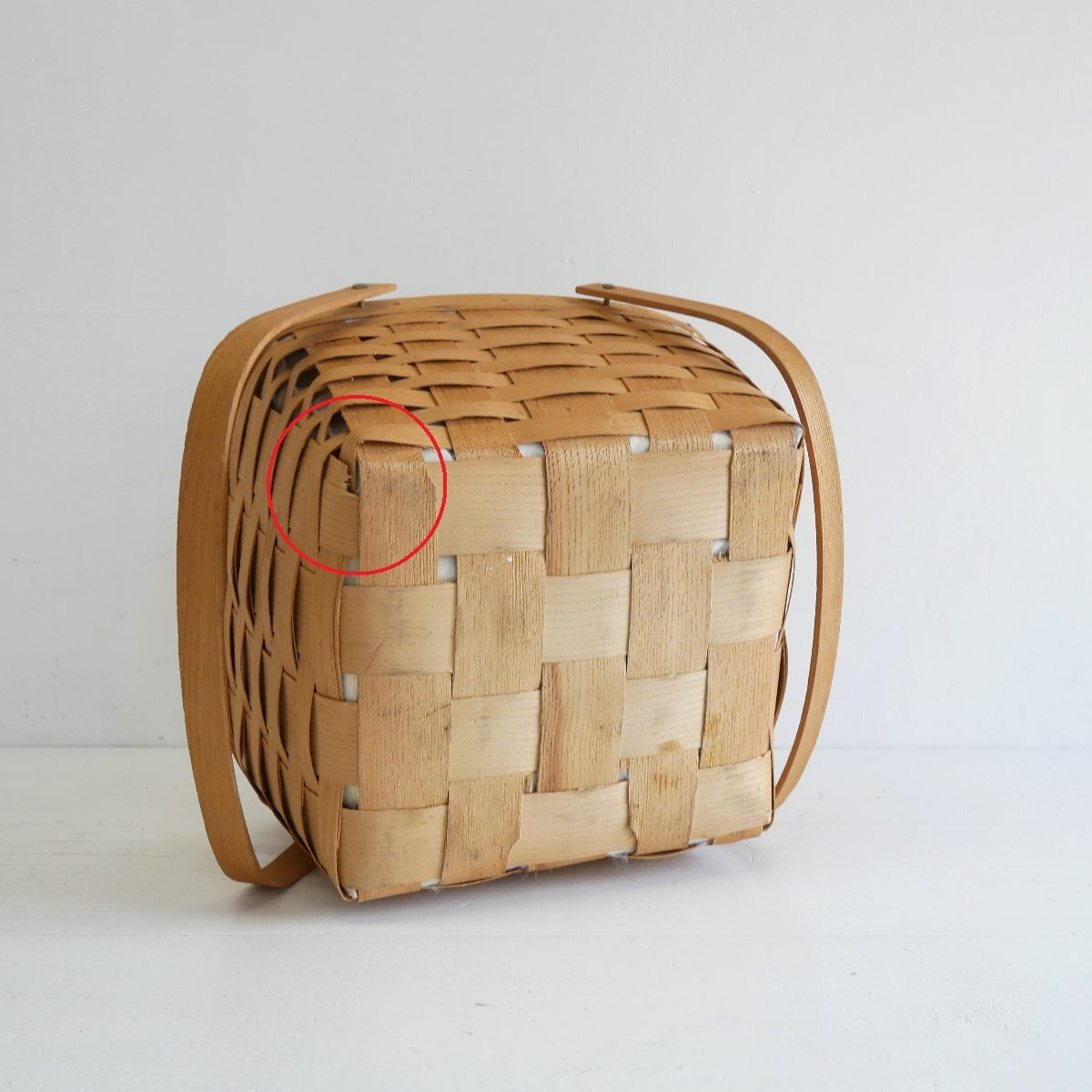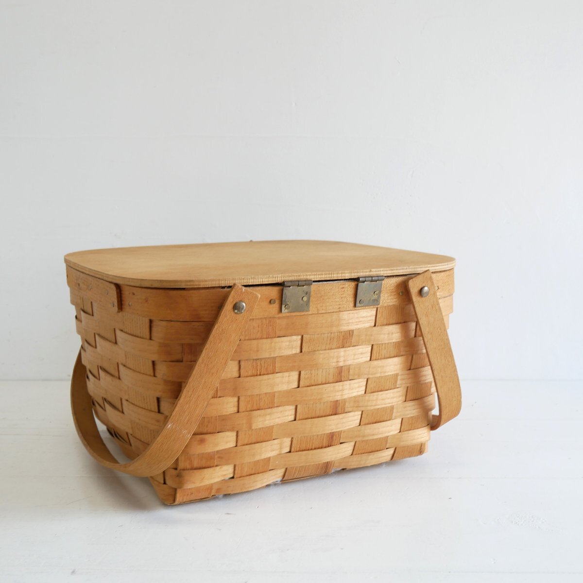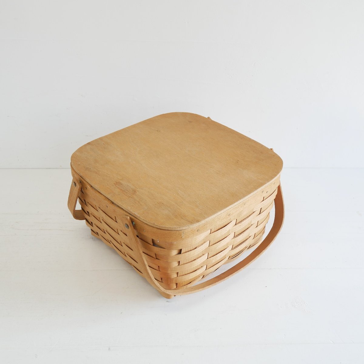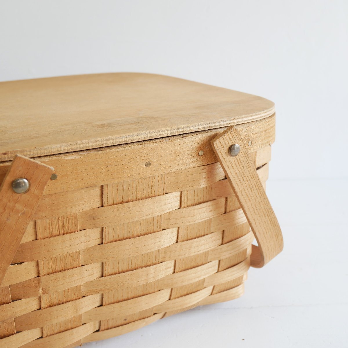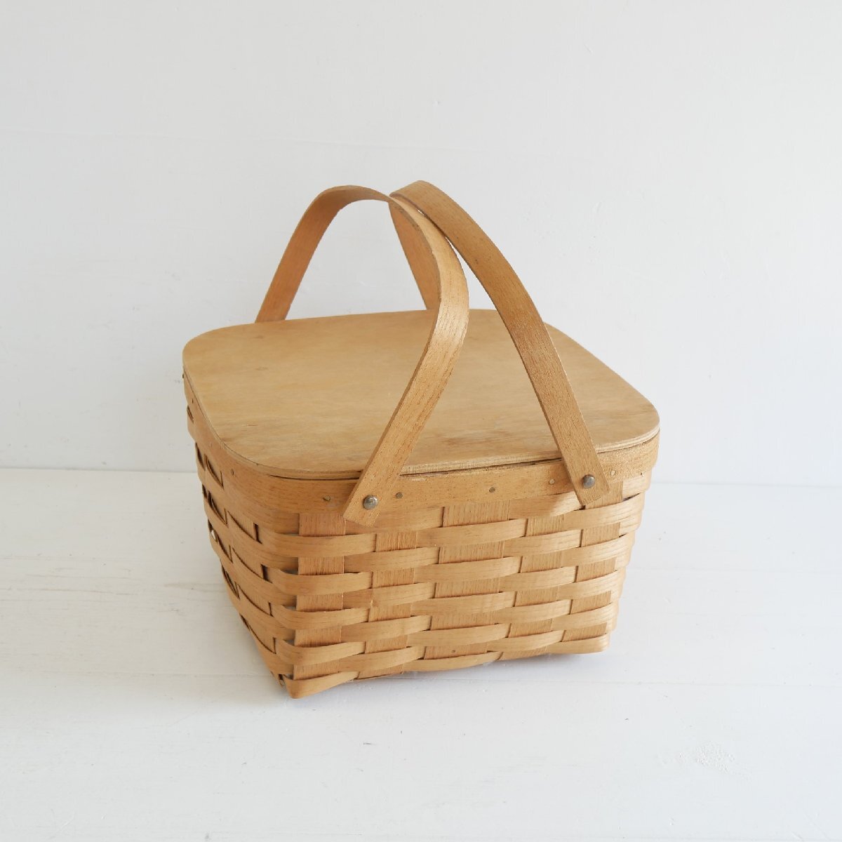 | 商品説明 explanation | アメリカの田舎町で見つけたピクニックバスケットです。 カントリーテイストで、素朴でお洒落です。 お部屋のインテリアにいかがでしょうか。 材質 : 木の皮、木、ビニール |