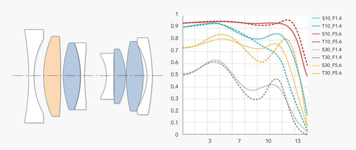 銘匠光学(めいしょうこうがく)TTArtisan 23mm f/1.4 C は、35mm判換算46mm相当の大口径標準レンズです。開放時のオールドレンズを思わせる味のある写りや、特徴のある外装デザイン、剛性の高い金属鏡筒による心地よい操作感など、クラシカルな雰囲気を楽しむことができます。大口径かつ最短撮影距離0.2mという基本性能を持ちながらも、全長を抑えたコンパクトなサイズで、小型のカメラにも装着したまま気軽に携行できるレンズです。 レンズ構成(6群8枚)/MTF図 仕様