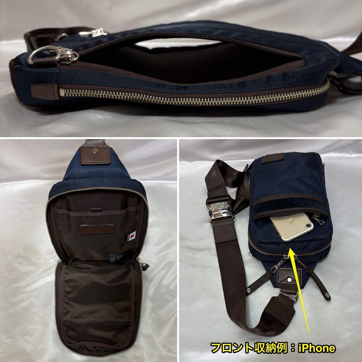 背面のファスナーポケットは肩に掛けたままiPhone スマホ、財布などを取り出せ、左右どちらからでもアクセスできる便利な仕様です。ショルダーストラップも左右どちらにも取り付けが可能です。