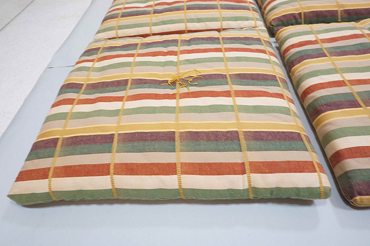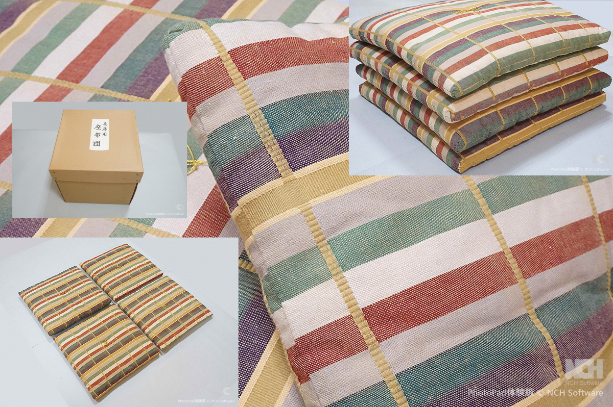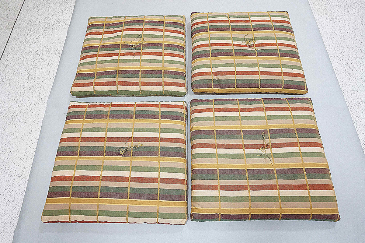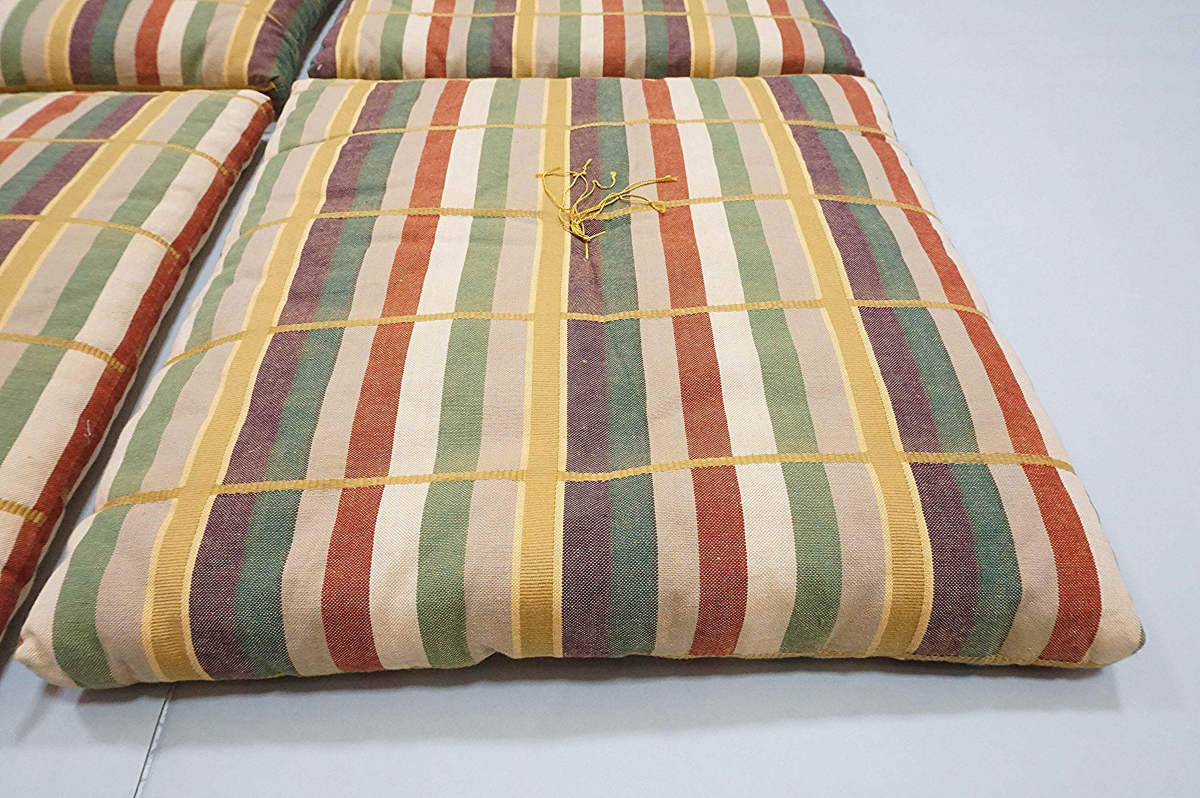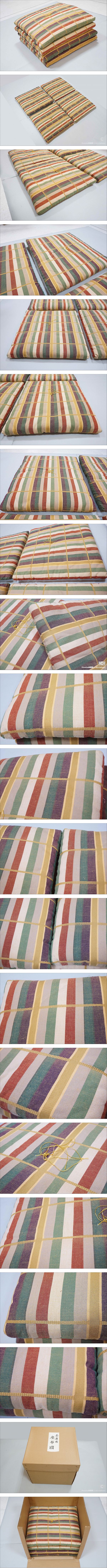 | 商品説明 | 縦縞模様のお洒落な茶席用座布団4枚です。状態は汚れシミなく未使用に近い無傷です。寸法は41㎝四方。紙箱入り。 |