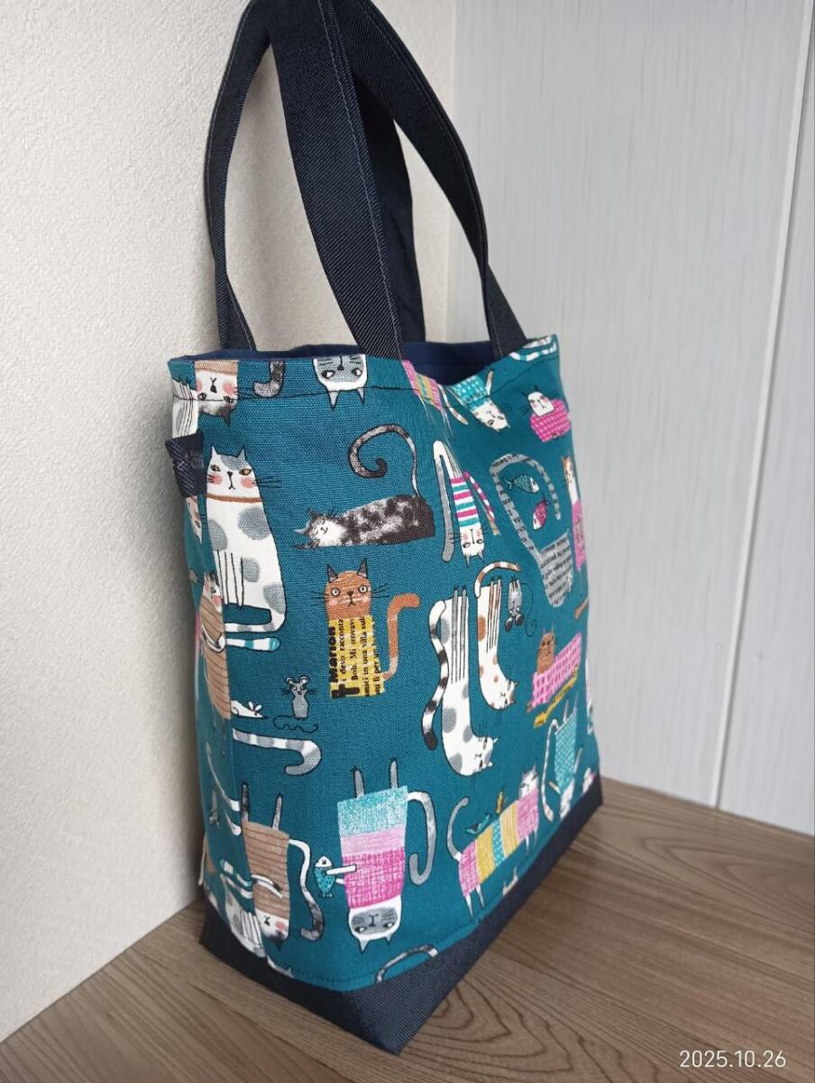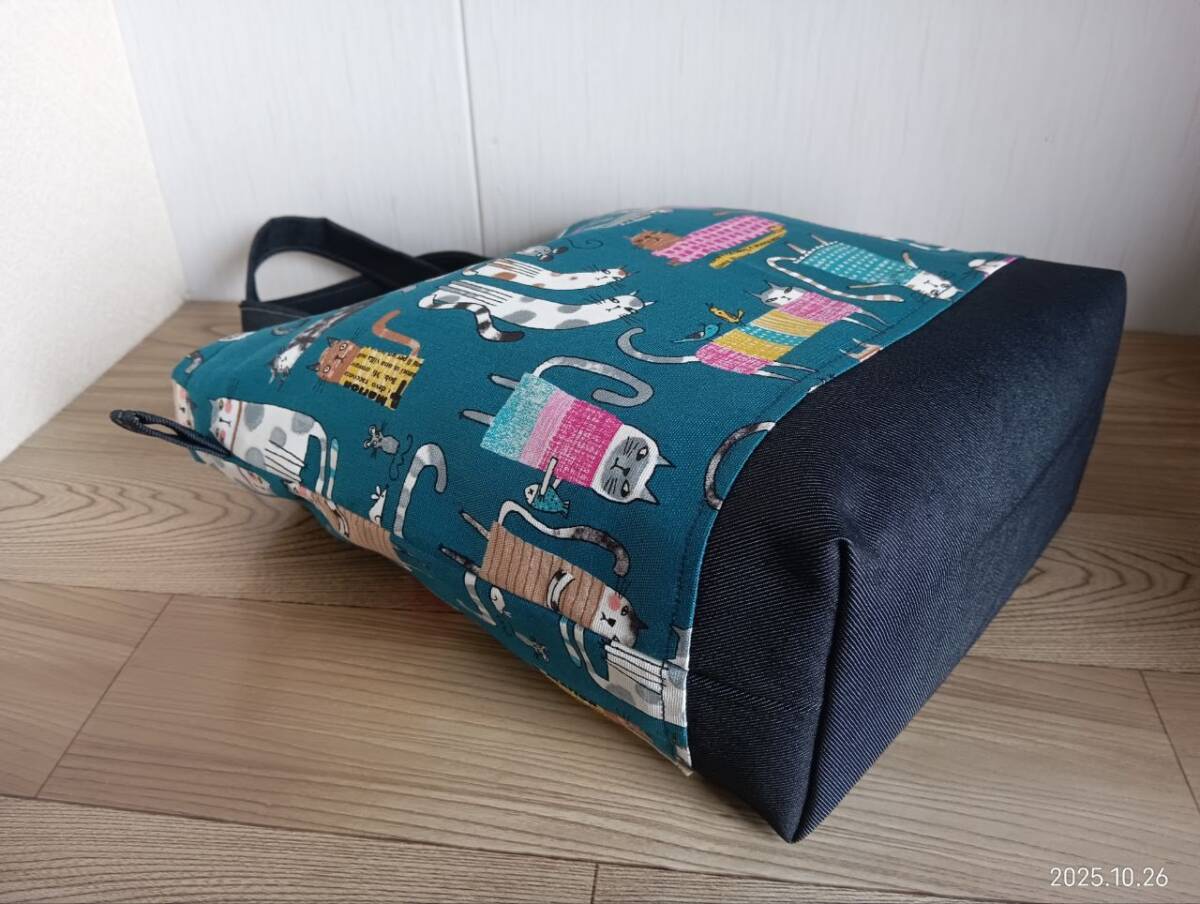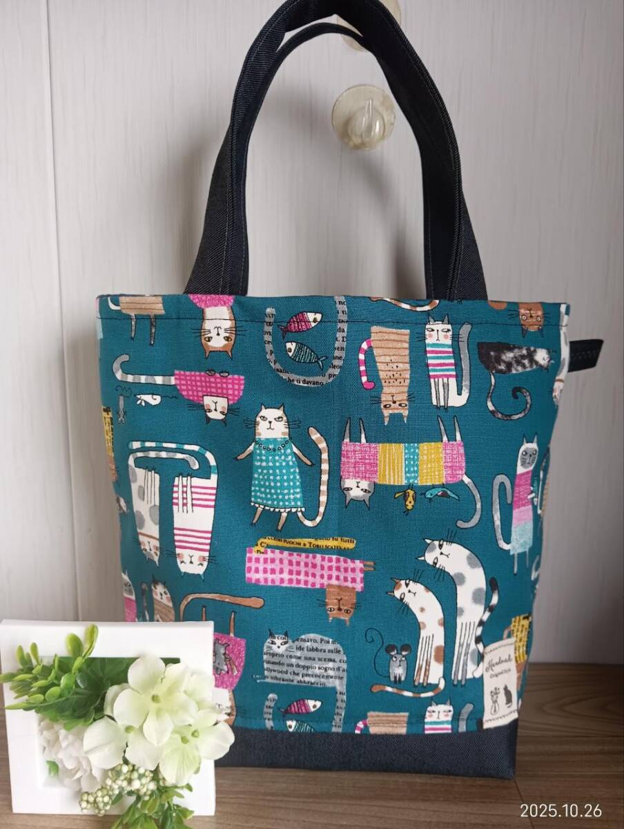 ハンドメイド かわいい 英字と猫柄にデニム トートバッグ 青緑