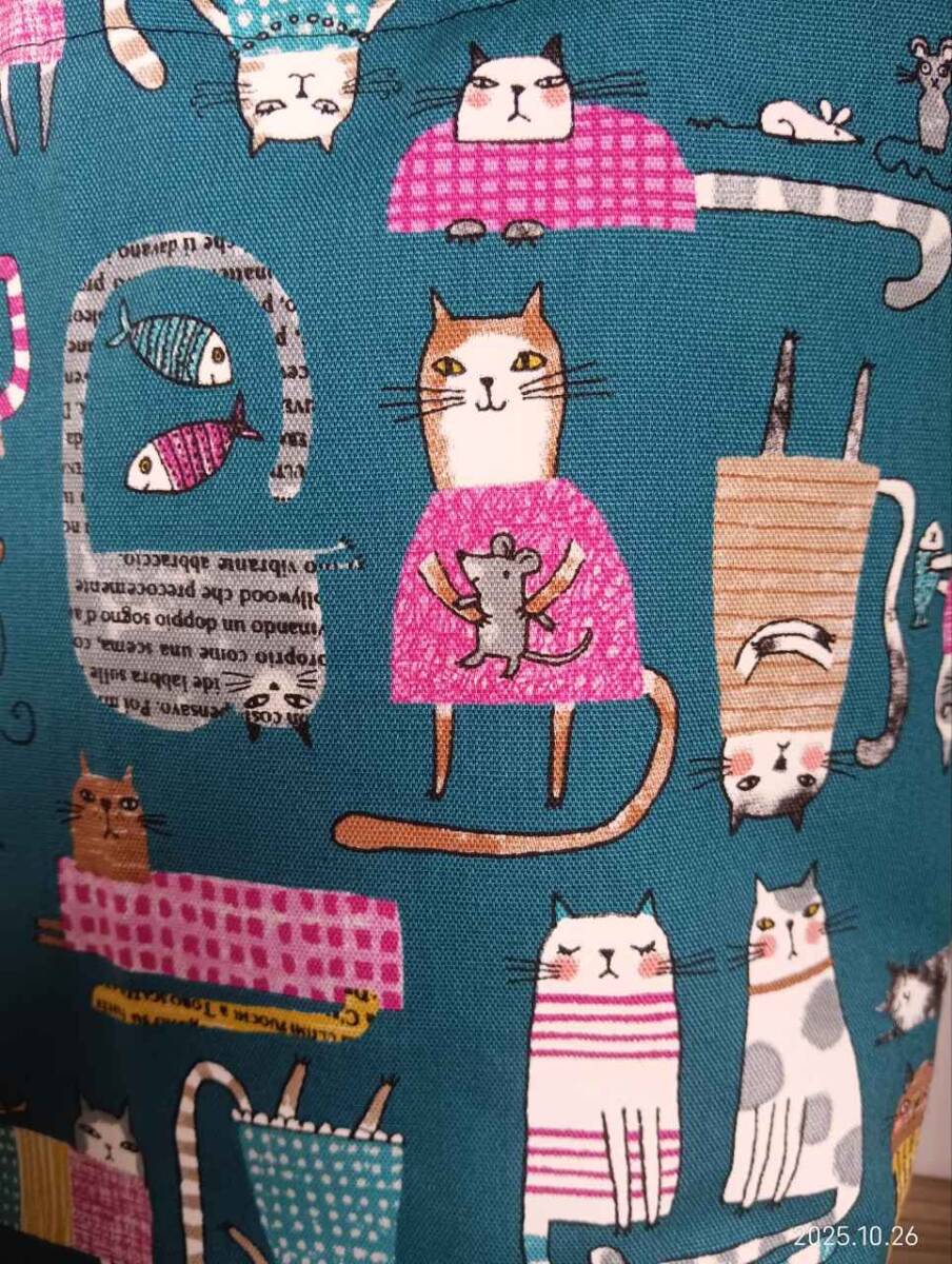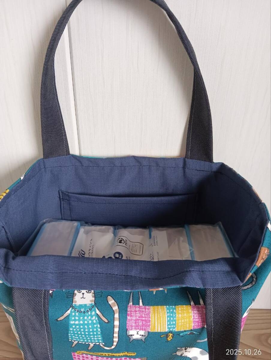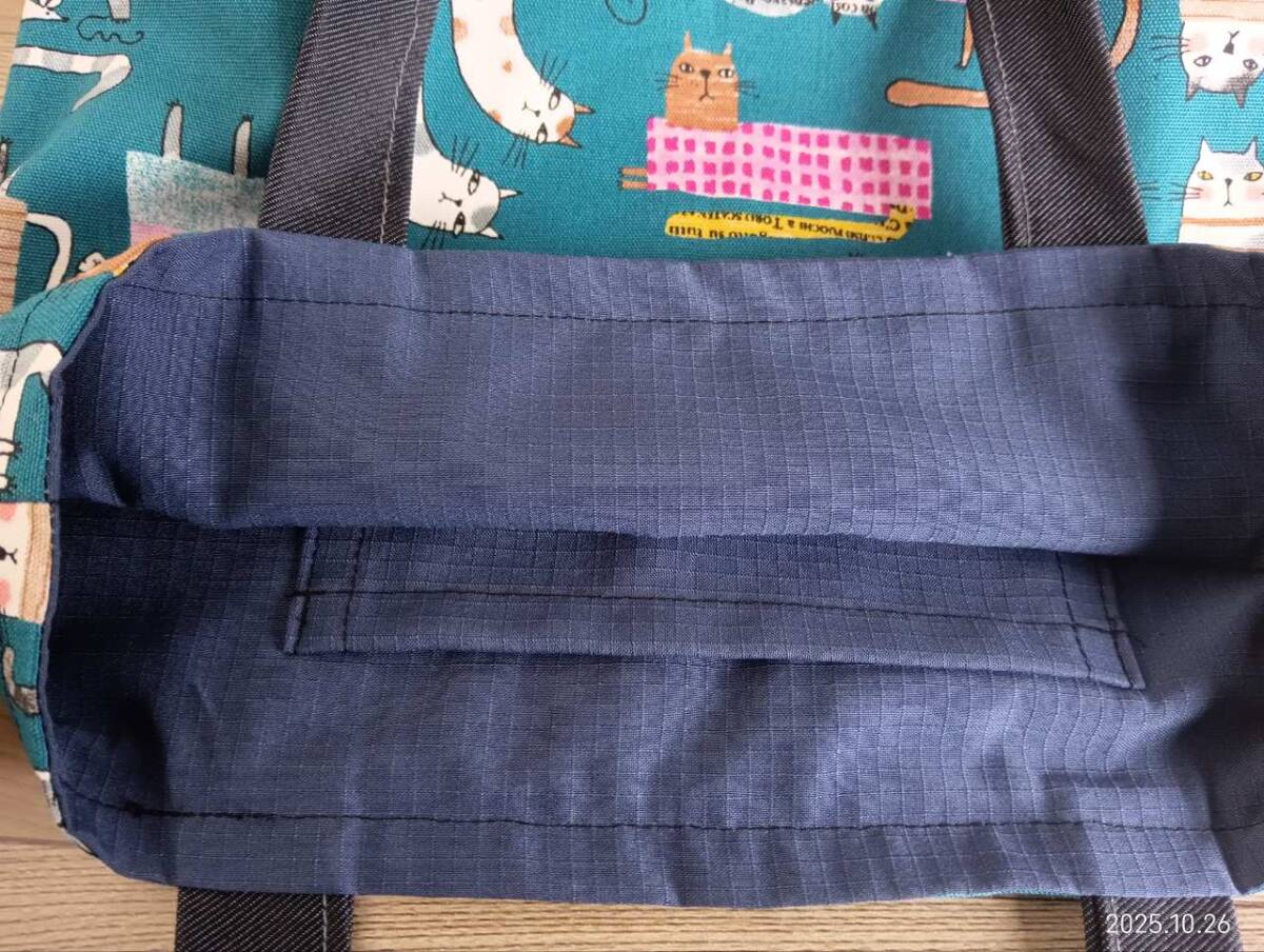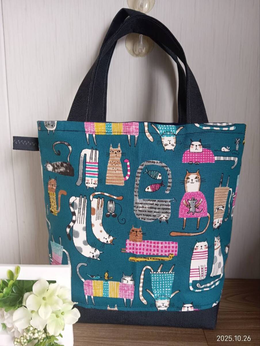 ハンドメイド かわいい 英字と猫柄にデニム トートバッグ 青緑