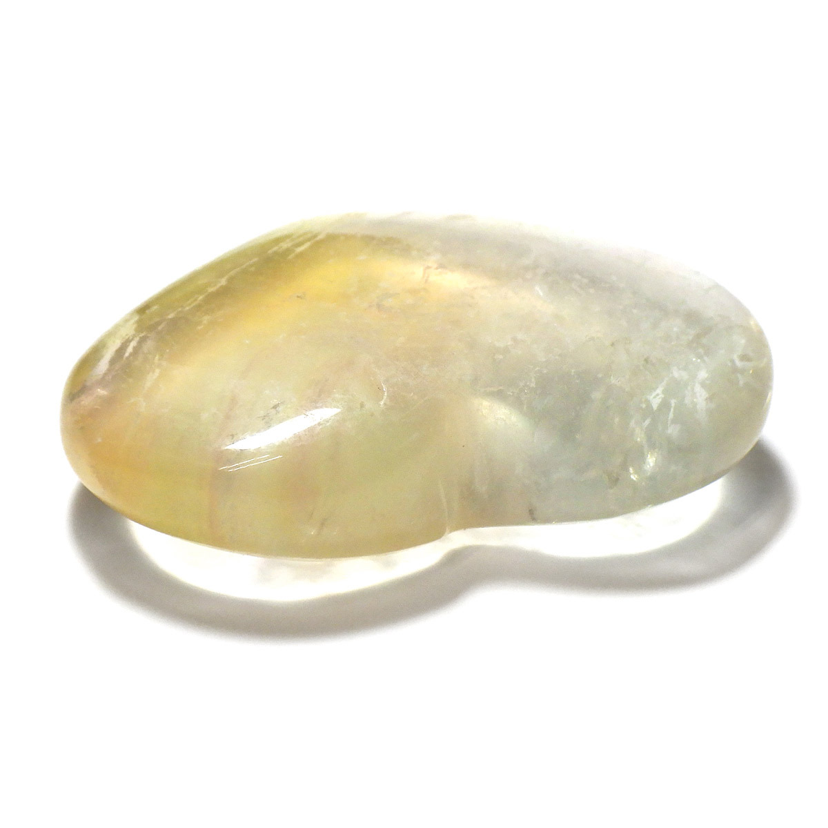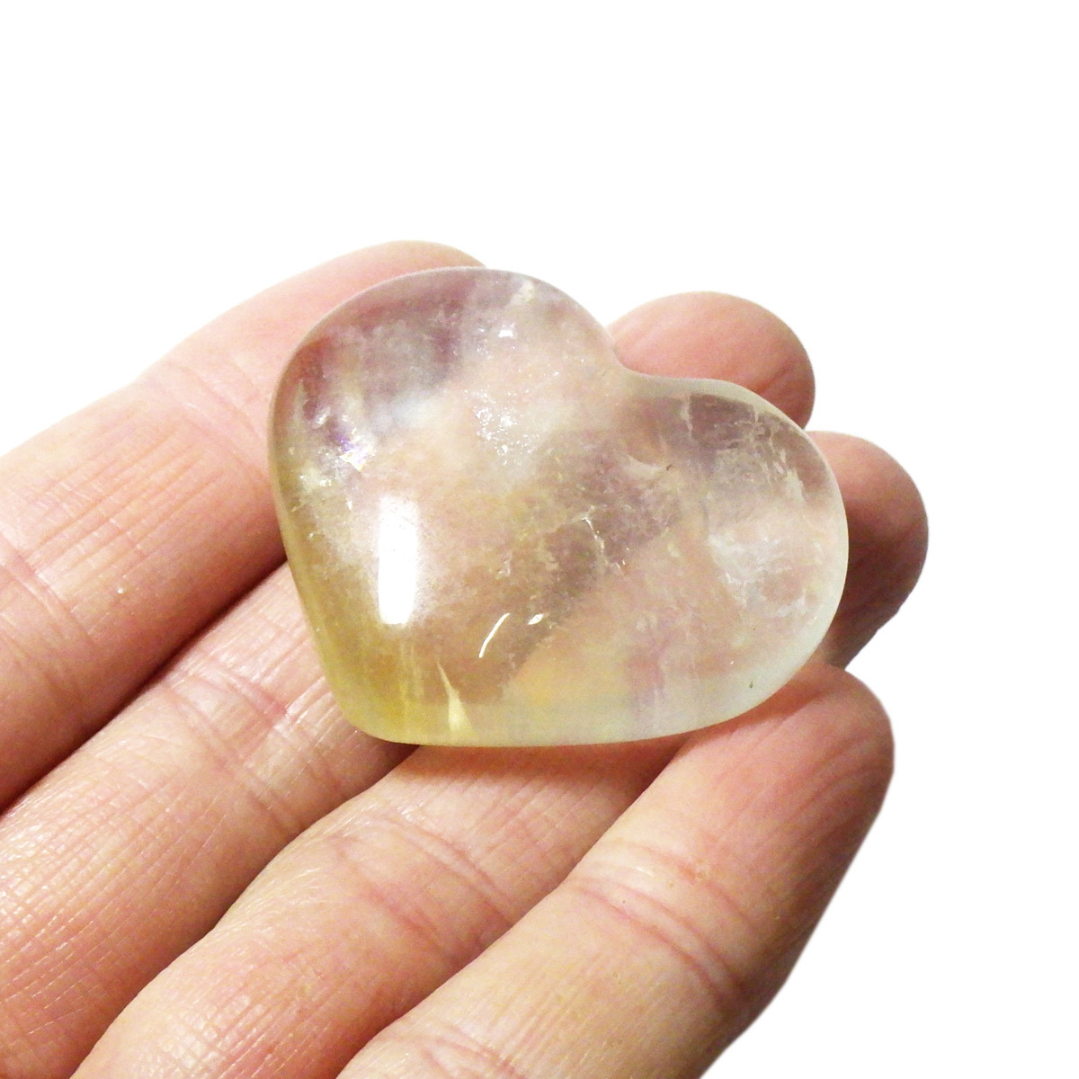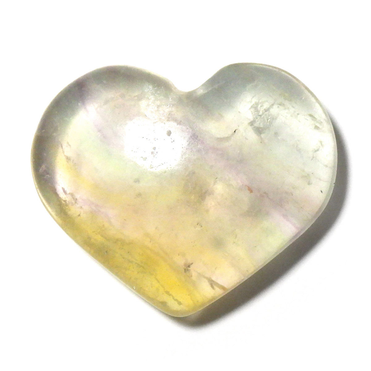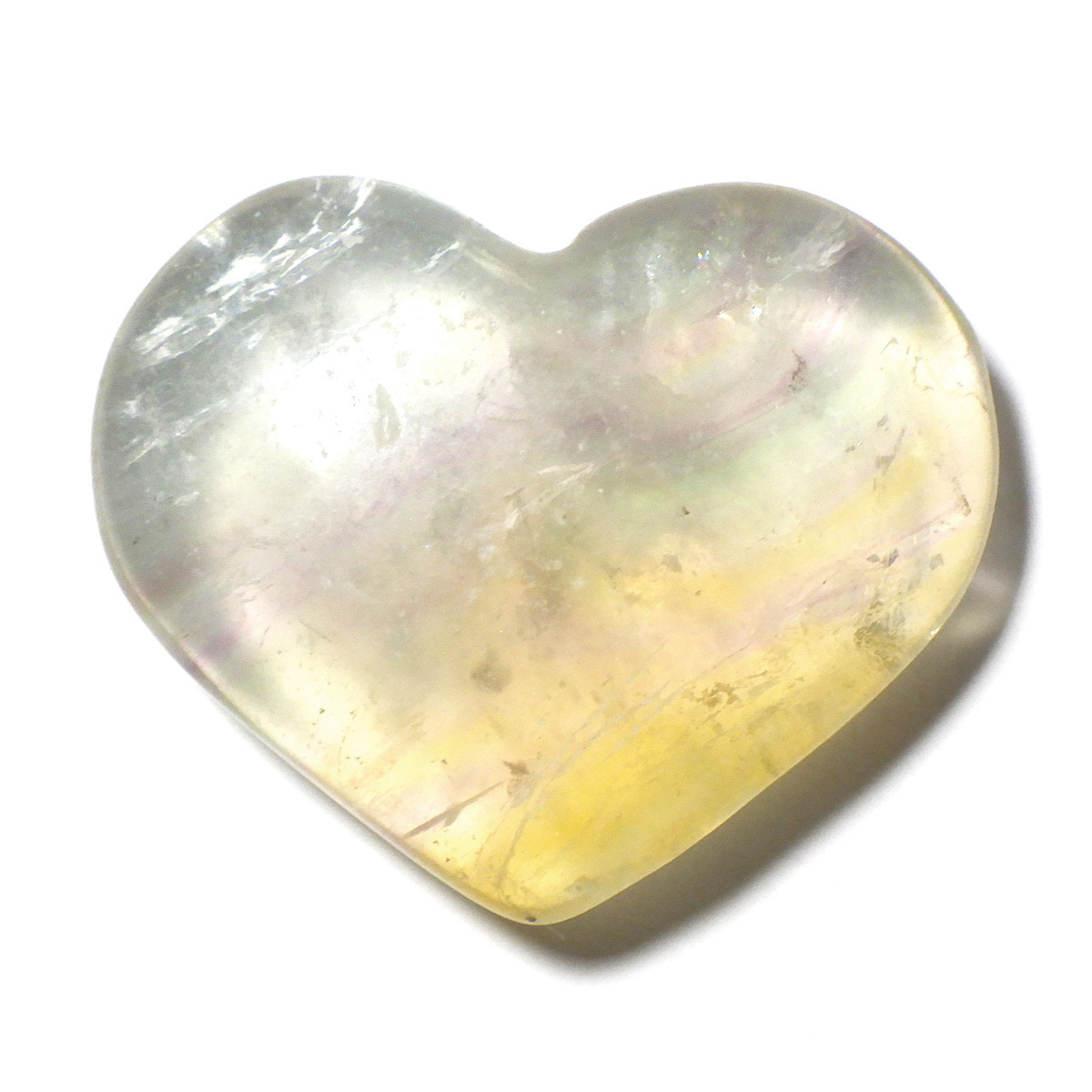 チャイナ産のフローライトで出来たハート形の置物です。透明度が非常に高く、ひとつの石の中に多彩な色彩が美しく広がっています。まさに蛍石(フローライト)という名の通り、光の角度によって異なる表情を見せてくれるのが魅力です。光にかざして透かすと、ピンクやグリーン、ブルーなどの色のグラデーションが複雑に入り混じり、幻想的な美しさを楽しめます。ハート形の優しいフォルムと相まって、インテリアとしてもかわいらしく、飾っていただけやすいかと思います。