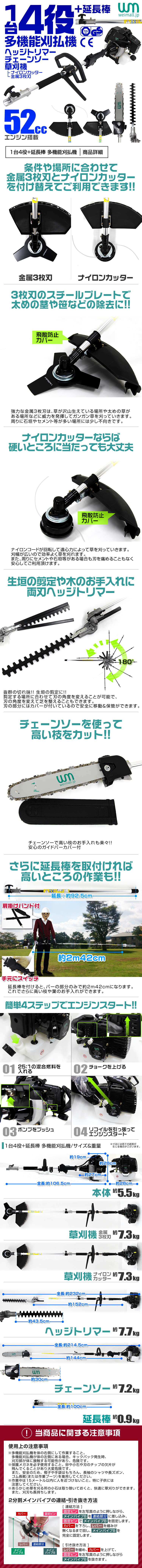 ナイロンカッターと3枚刃の刈払機とチェーンソーとヘッジトリマーの4種類の作業がこれ1台でできちゃいます。 さらに延長棒を付ければ、女性の方でもらくらく枝きりも可能です! 52ccのハイパワーなエンジンでハードな場面でも重宝する1台です。 分割式なので運搬や収納が便利! 軽作業から農家、造園業の方に! 【商品仕様】 ・エンジン:2ストローク ・排気量:52cc ・重量:8kg ・燃料:混合油(25:1) ・始動方式:リコイルスターター ・燃料タンク容量:1.2L 【商品内容】 ・本体 ・工具一式 ・延長棒 ×1 ・刈刃(3枚刃) ×1 ・ソーチェン ×1 ・ヘッジトリマー ×1 ・ナイロン草刈カッター ×1 ・肩掛けバンド 【注意事項】 ・防護メガネ(ゴーグル)、手袋、安全靴を必ず着用し、作業時の安全に心がけてください。 ・作業時に刈刃の回転により石飛びの可能性があります。人身および物損事故のないように十分ご注意ください。 ・当商品を使用した際に発生したトラブル、事故につきまして、当社は一切の責任を負いかねます。 ・当商品は入荷の時期によりカラー、仕様などが変更される場合があります。ご了承下さい。(色指定はできません。) |