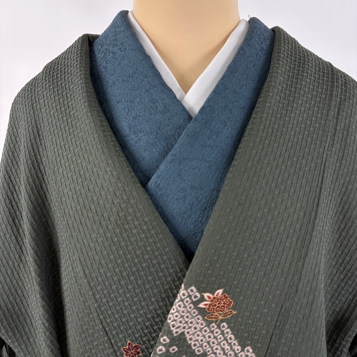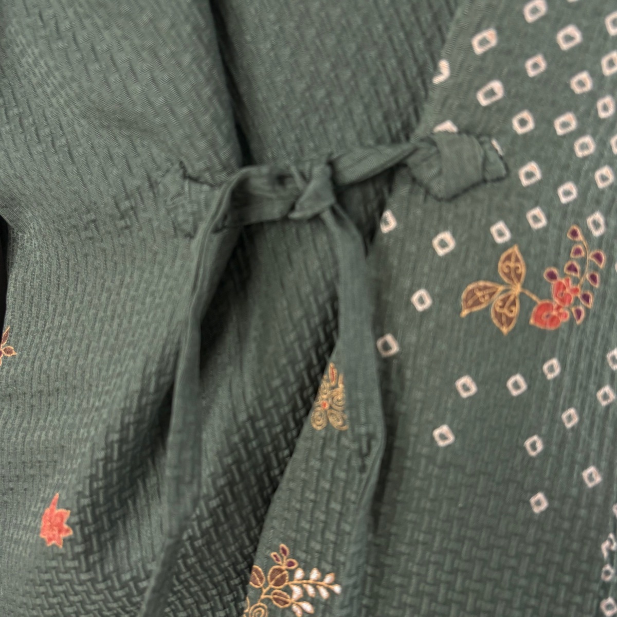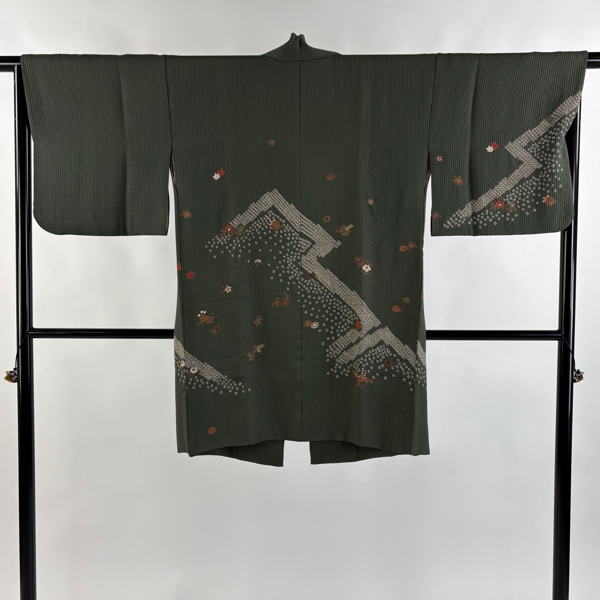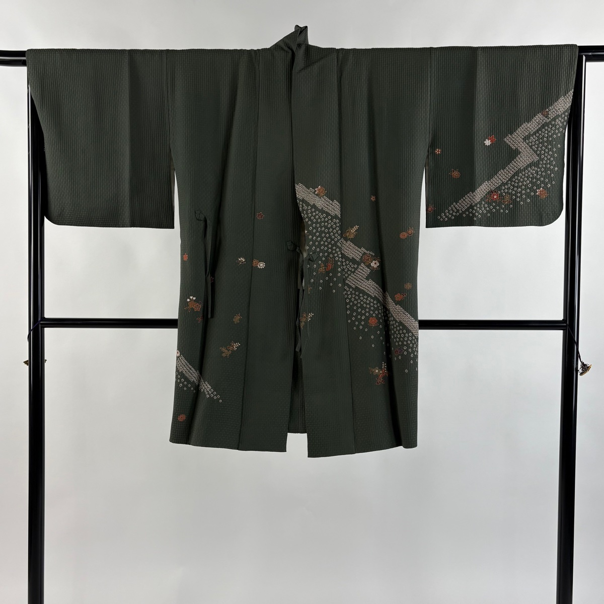 | 道中着 秀品 和装コート 草花 疋田 金彩 灰緑 身丈93 裄丈65.5 M 正絹 【中古】 |