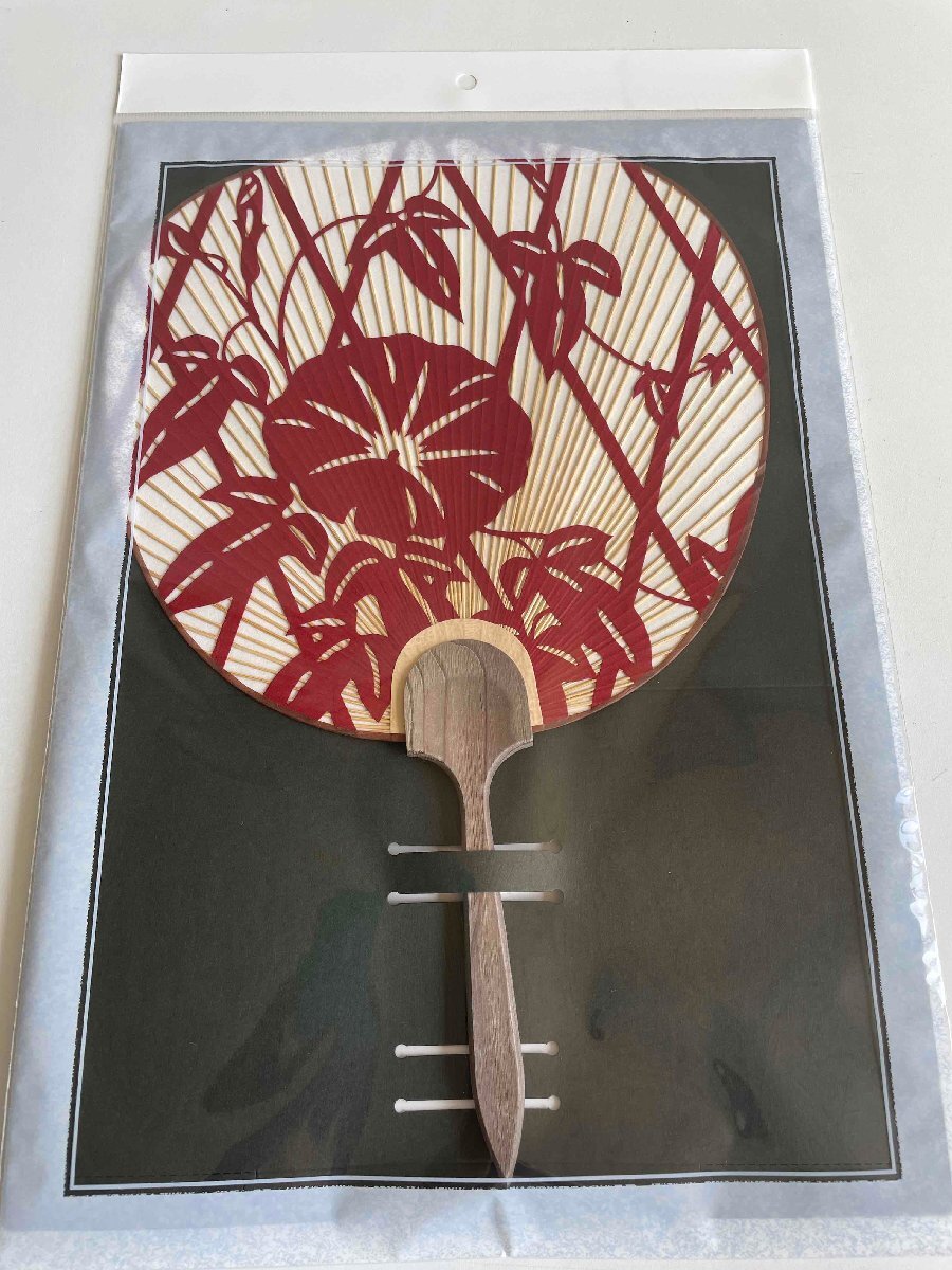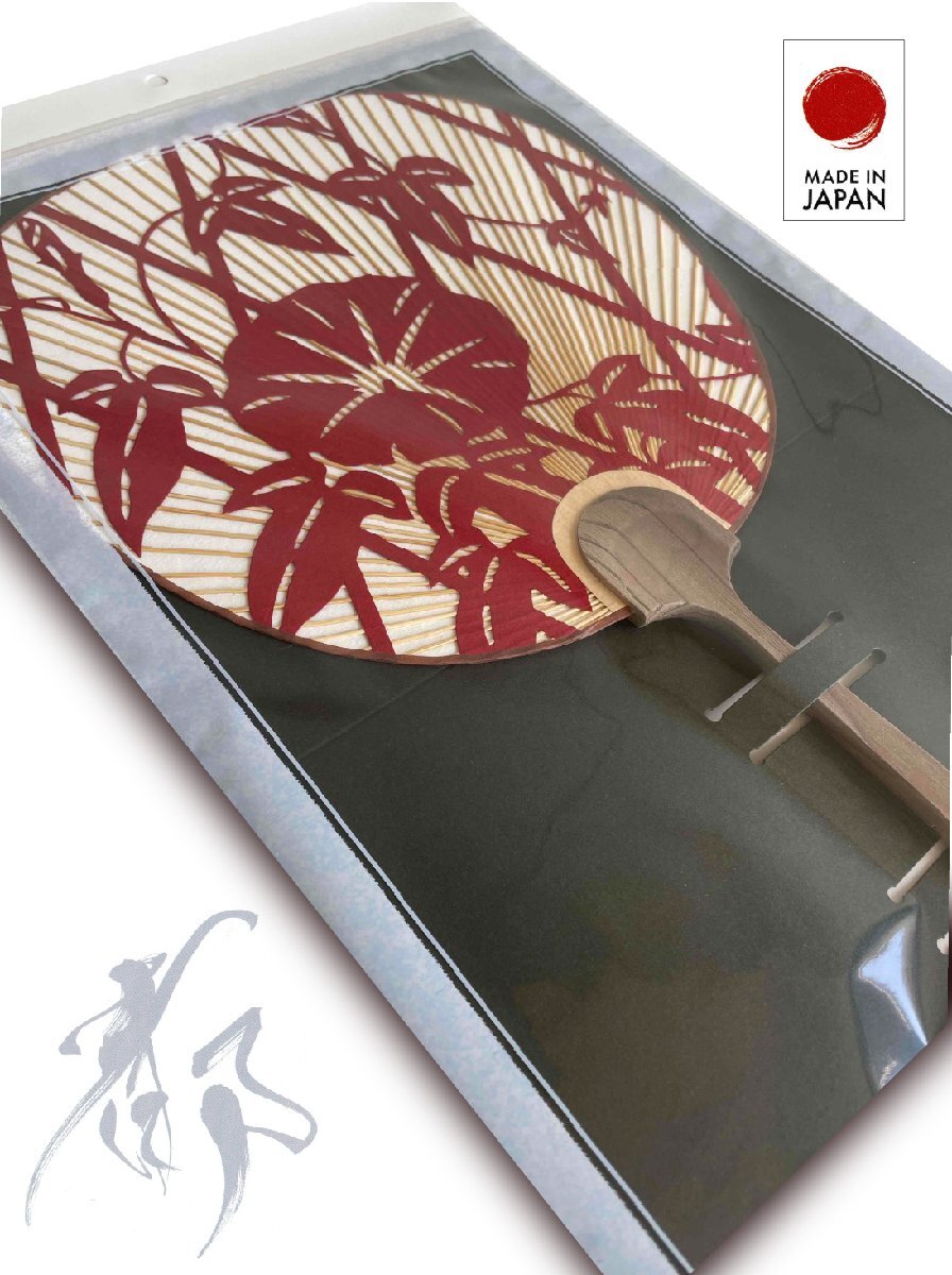 都うちわ 手漉き和紙 総彫 垣根朝顔(赤) 杉柄 京うちわ うちわ立て台紙付パッケージ入り 団扇 日本の夏 お土産