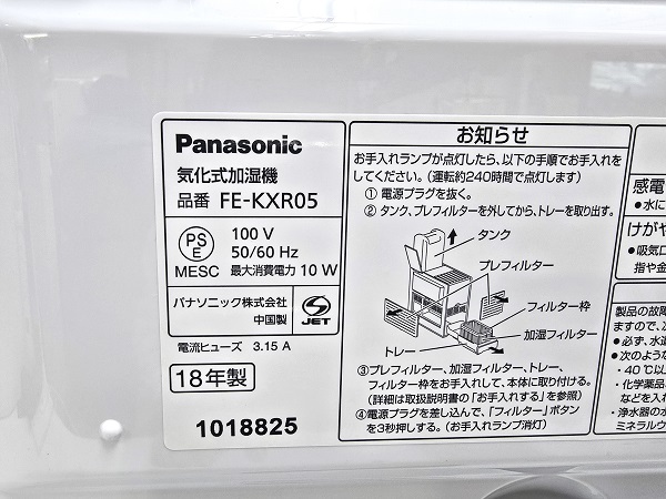 【中古品】 パナソニック Panasonic 気化式 加湿器 ~8.5畳 FE-KXR05 2018年製 ホワイト ○YR-18500○ の出品です。