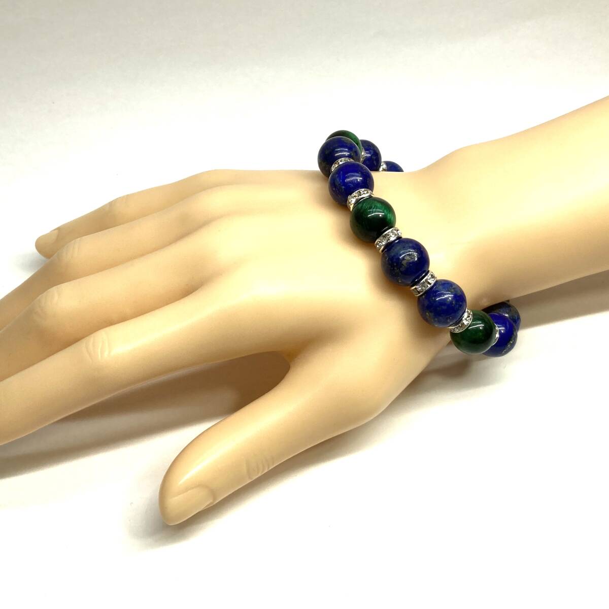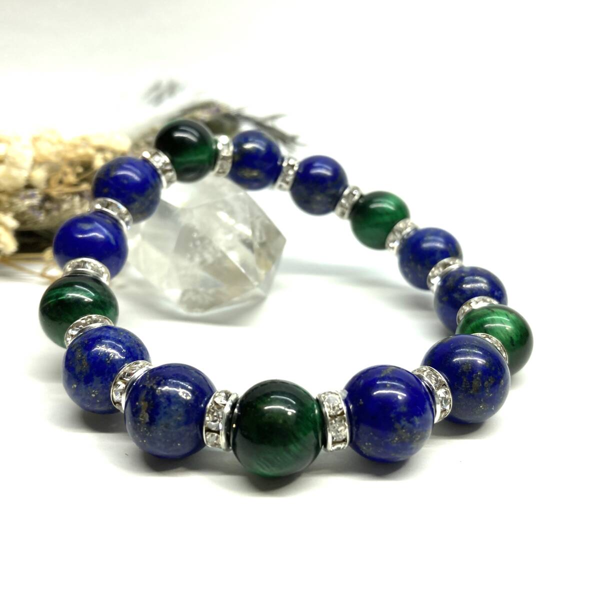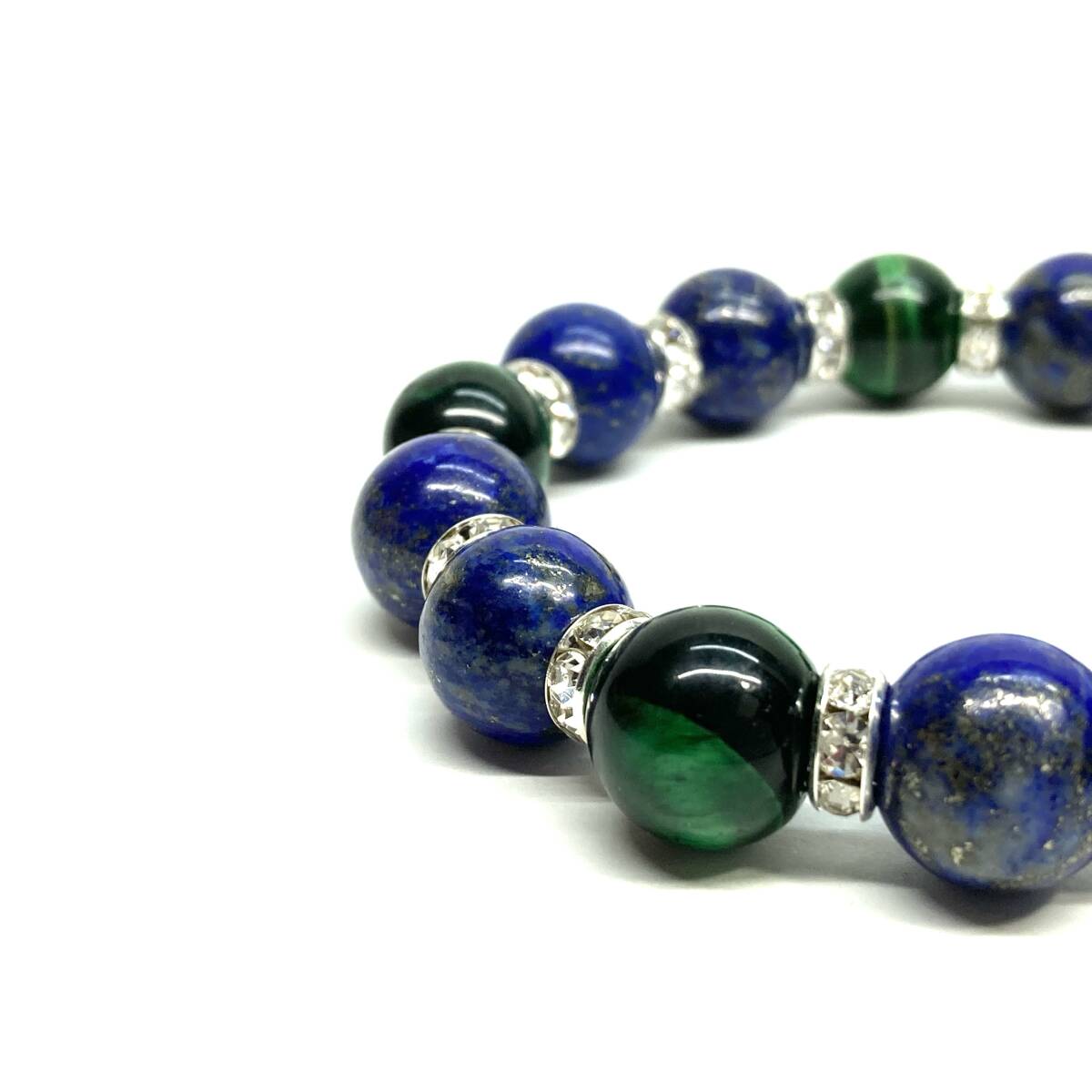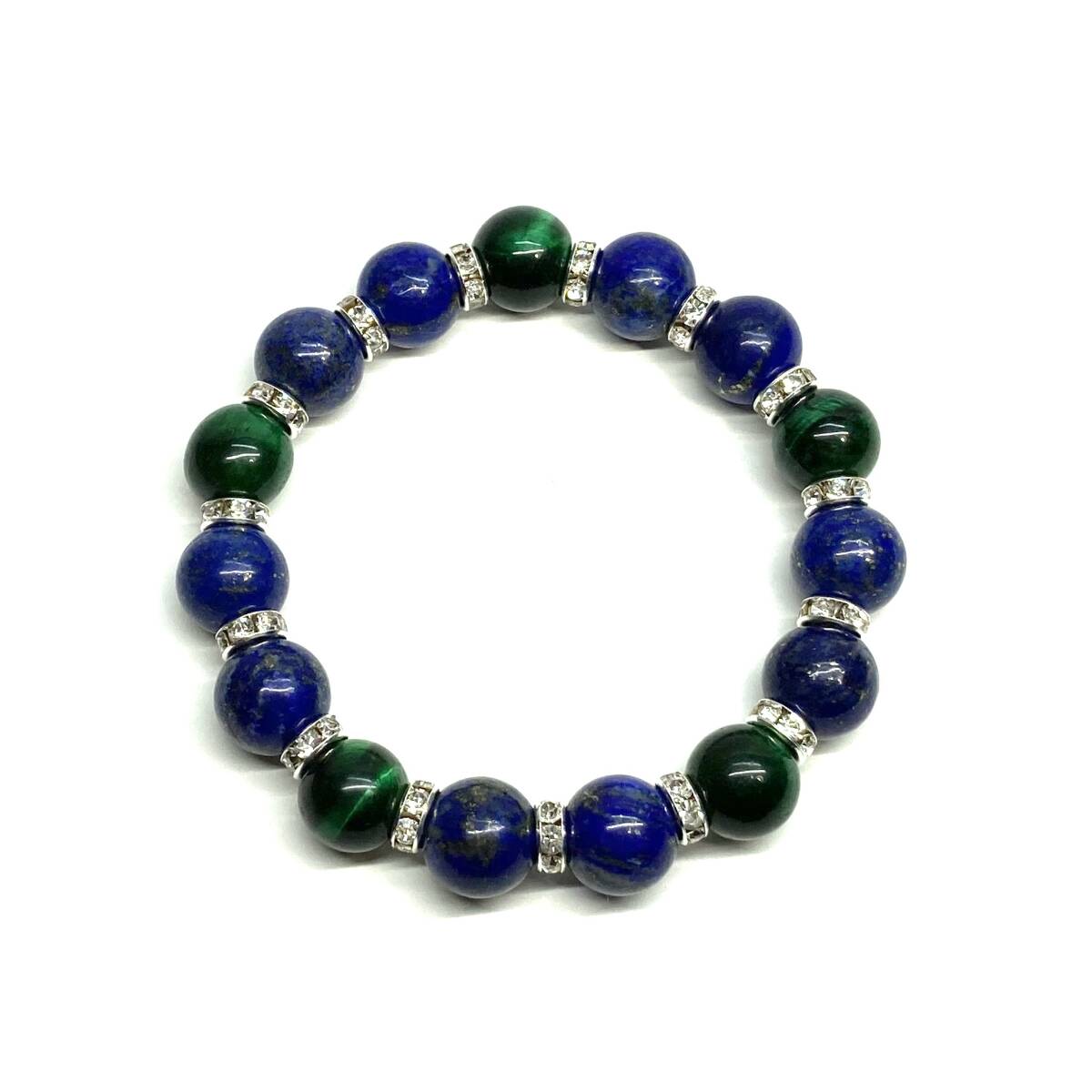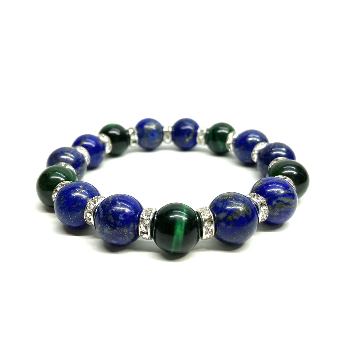 こちらは、ラピスラズリとグリーンタイガーアイを組み合わせたパワーストーンブレスレットです。間にはロンデルを挟み高級感あるデザインに仕上げております。程よくインパクトがある12mm玉を使用して内周約18cmです。(サイズ変更の場合は取引ナビにてご連絡をお願いします。) 数に限りがございますので気になる方はお早めにどうぞ。