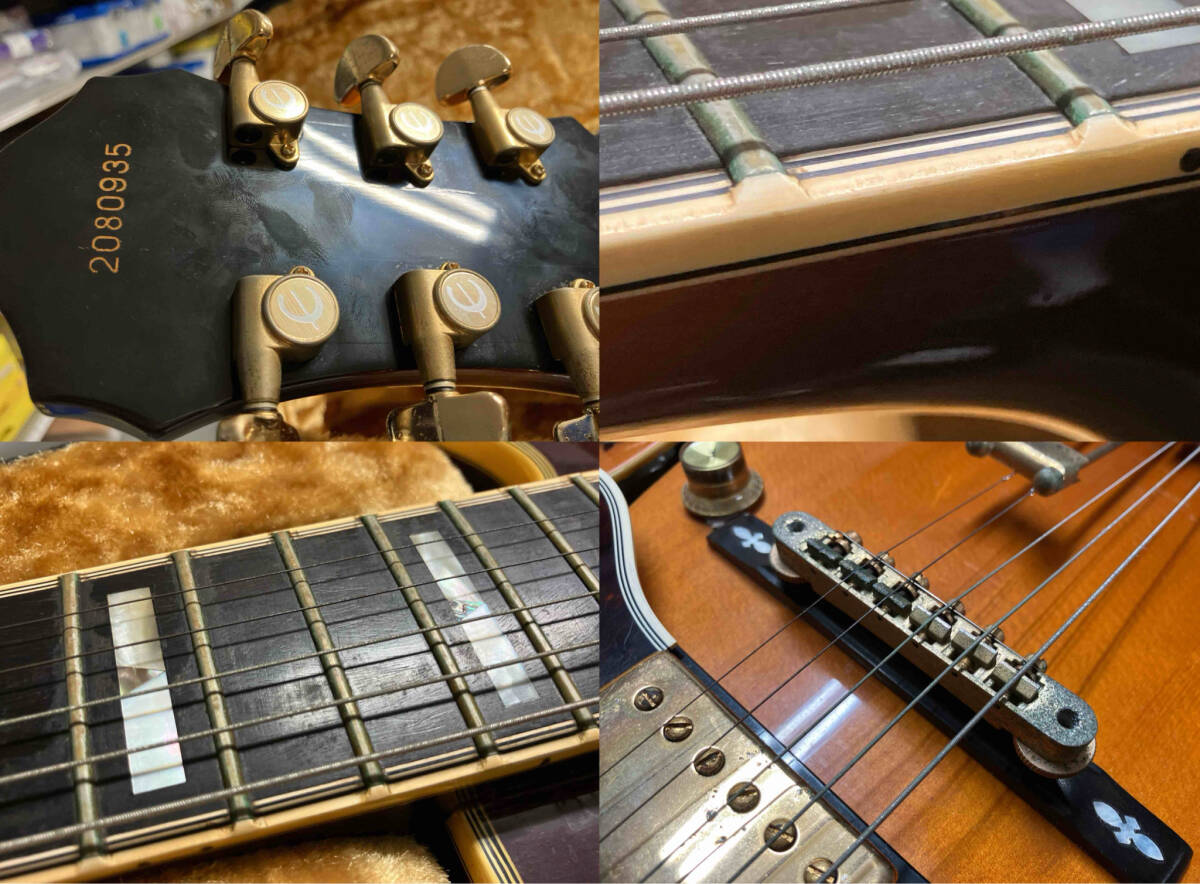 | ヒビや割れはございません。 アンプ接続にて音出ました。 フレット削れがあり平らになっております。金属部分に錆やくすみがございます。 現状お渡しとなります。 ギターケースがタカミネのものになります。 |