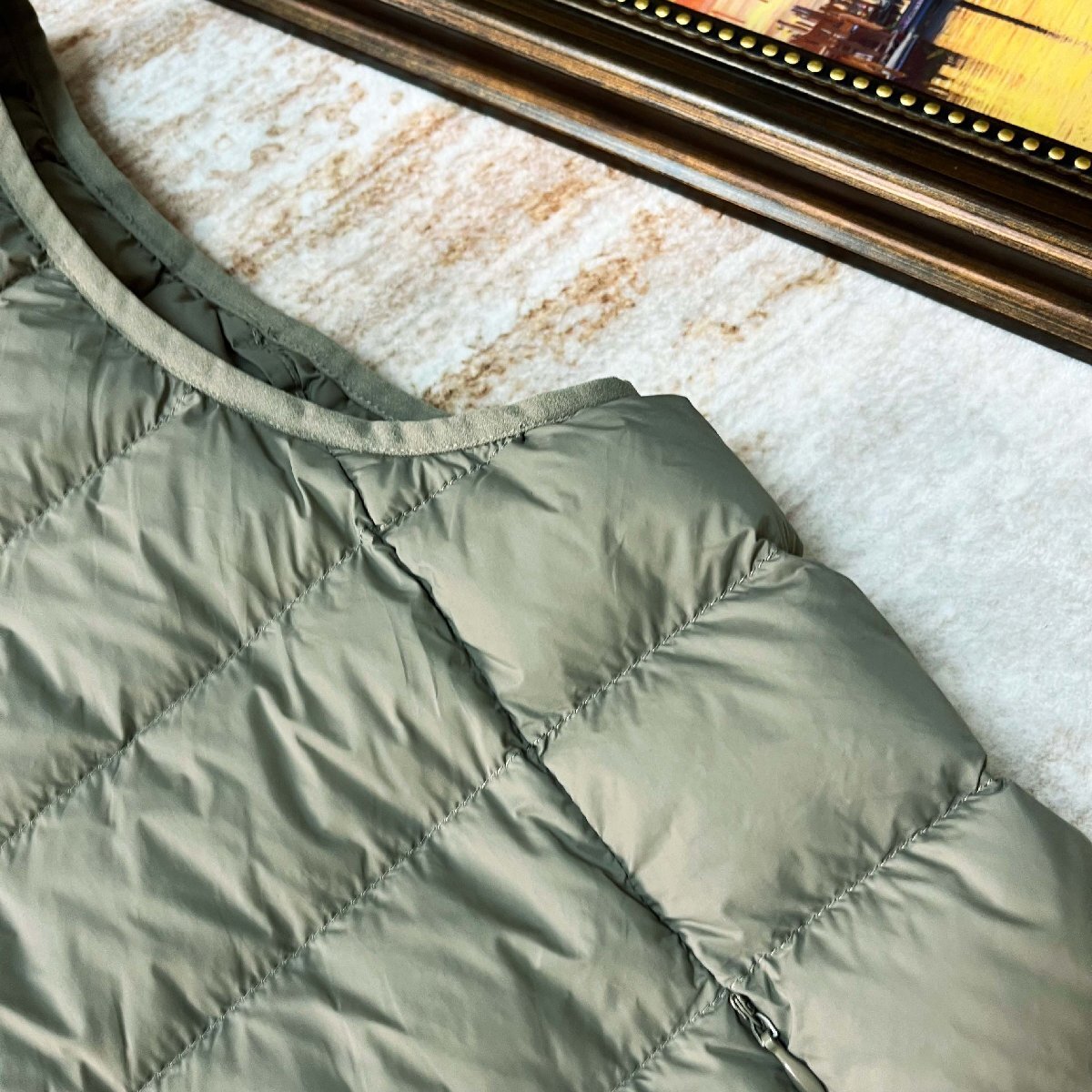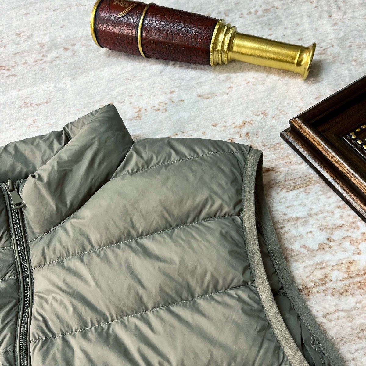 表地には頑丈な素材を使用しており、軽くて滑らかな手触りが特徴です。中綿には90%ホワイトダックダウンと10%フェザーを採用し、優れた保温性を発揮。薄手ながらもしっかりと暖かさを感じられるこの素材は、秋冬に最適な防寒機能を実現します。