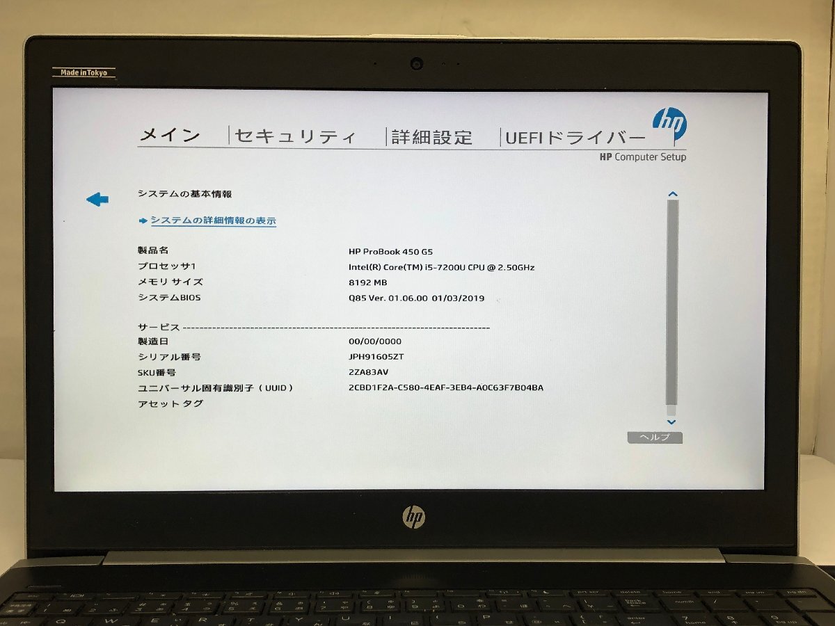 ジャンク/ HP HP ProBook 450 G5 Intel Core i5-7200U メモリ8.19GB ストレージ無し 【K24000】