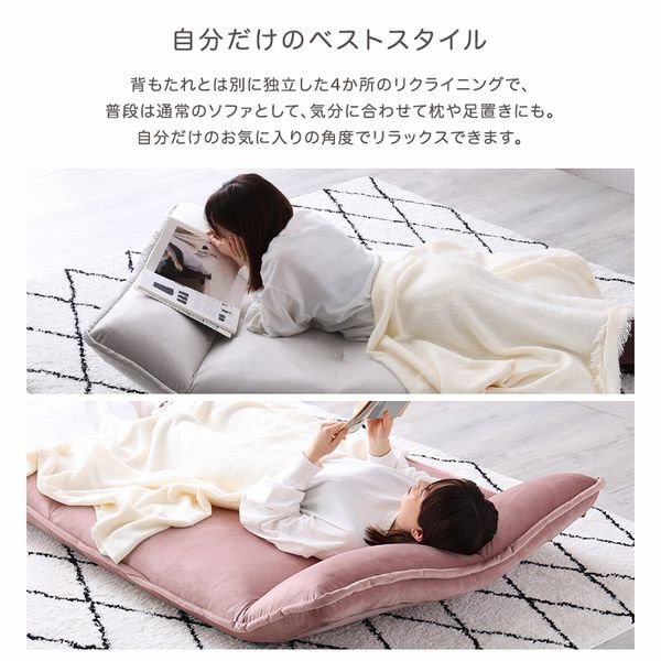 | 大人かわいいいマルチリクライニングローソファ! 背もたれと両肘4か所の計5か所がそれぞれ14段階にリクライニングすることで、自分好みの形で使用することができます。 クッション性のあるウレタンで体を包み込みます。 ソファとしてもベッドとしても使える万能なソファです。 |