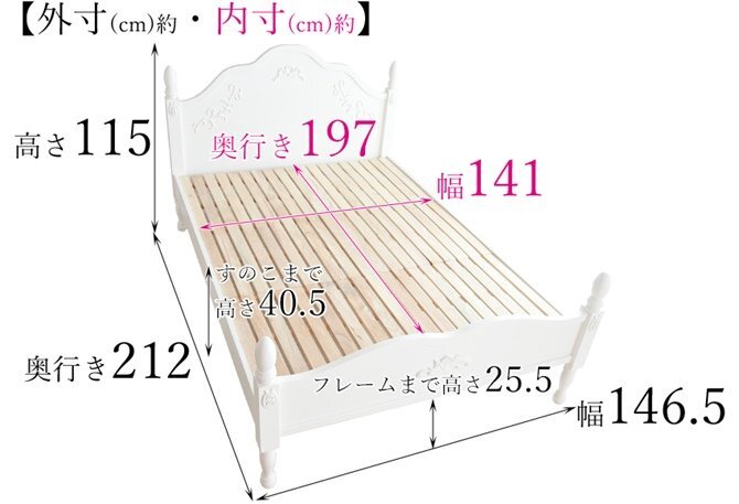 | 商品説明 | Made in INDONESIA おうちで、プリンセス♪あなただけの、シンデレラストーリー!! 『スノーホワイト プリンセス プチROCOCOシリーズ』 プチロココで可愛い趣…プリンセスなシャレた雰囲気が好きな方に!! 寝室の主役は、もちろんベッド!! お気に入りのデザインのベッドだったら…豊かな眠りをお約束できます!? ときめく目覚めで、おもてなし。 ゆったりサイズのダブルです。 アンティークな雰囲気にも、シャビーテイストにも!! 意外と合わせやすいスノーホワイトカラーです!! 滑らかな曲線、リボンやお花のモチーフなど、可愛いプチROCOCOなデザイン。 脚部もしっかりした作りです。 ※イメージ写真に一緒に写っている他の家具や小物は商品に含まれません。 【サイズ(cm)約】 幅146.5×奥行き212×高さ115 床からすのこ面までの高さ40.5 床からフレームまでの高さ25.5 内寸:幅141×奥行き197 【材質】 マホガニー天然木(輸出許可マホガニー天然木) MDF 【生産国】 インドネシア 【備考】 組立て ※落札価格に消費税が掛かります。 ※お使いのモニターや照明器具などで、実際の色とは若干異なって見える場合があります。 ※アウトレット商品のため、多少の色ムラ、小キズが見られます。使用には問題ありません。 ※ヤフオク以外でも販売していますので、出品中に在庫が無くなった際は、出品を取り消す事がございます。 |