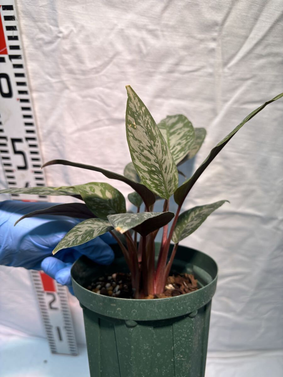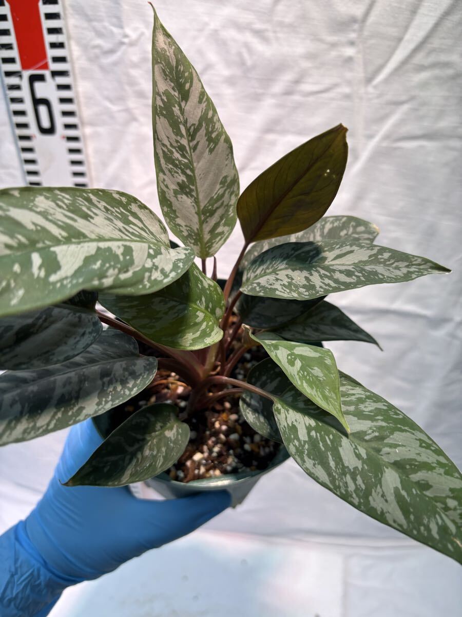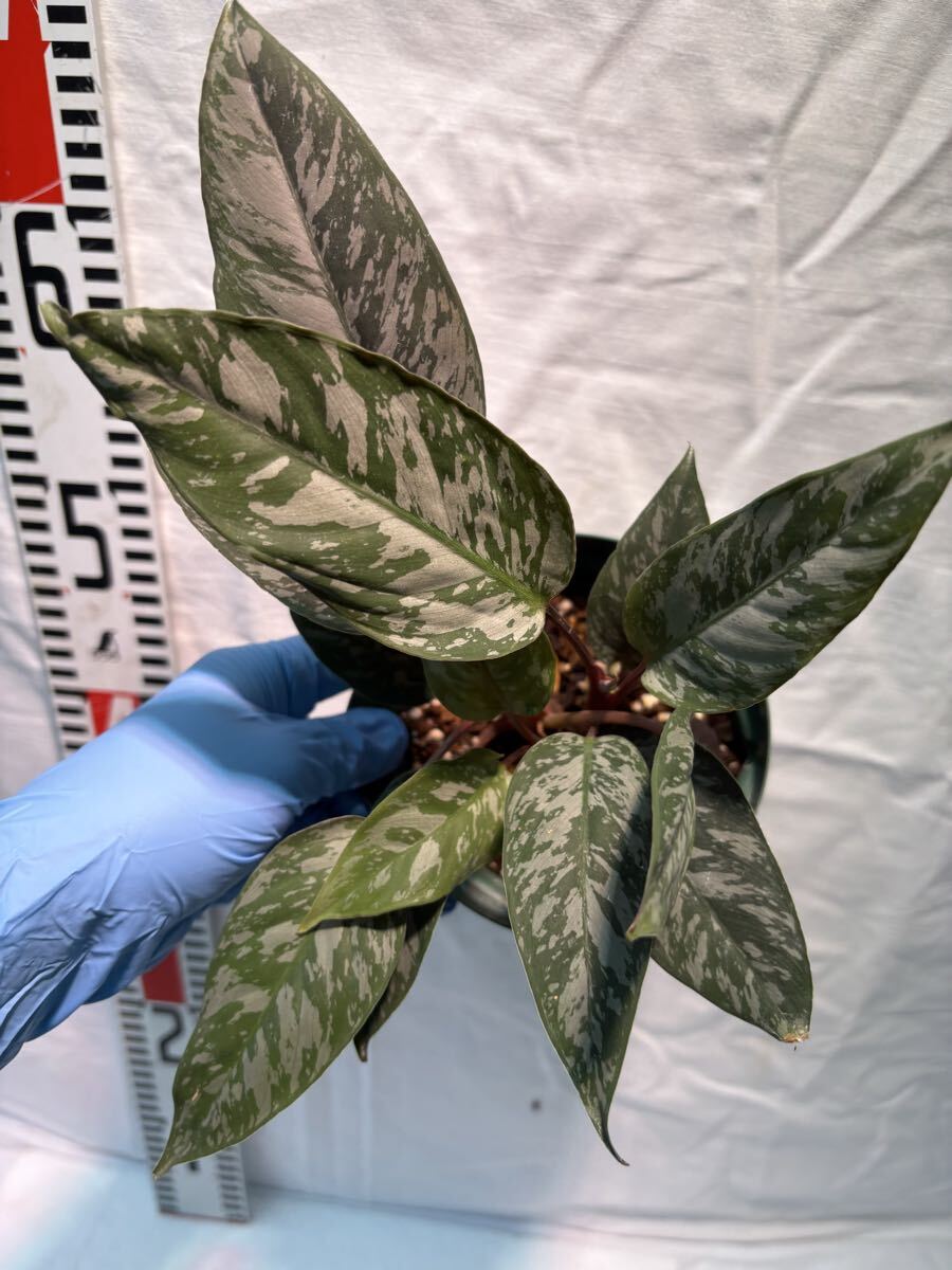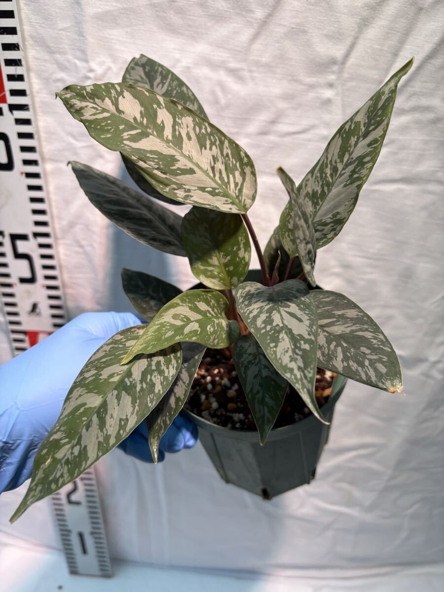 濃いグリーンにシルバー系の斑が美しい、サトイモ科の観葉植物アポバリス:アクミナティッシマです。バーガンディカラーの葉裏とのコントラストも美しいです。比較的湿潤な環境を好みます。アグラオネマと同じようなイメージの育てられます。質感、紋様が非常に美しいアポバリスの葉裏はカラテアの様にボルドー色でコントラストが美しいですが、質感が異なります。未だ日本ではメジャーな植物ではなく、あまり見かけない植物。