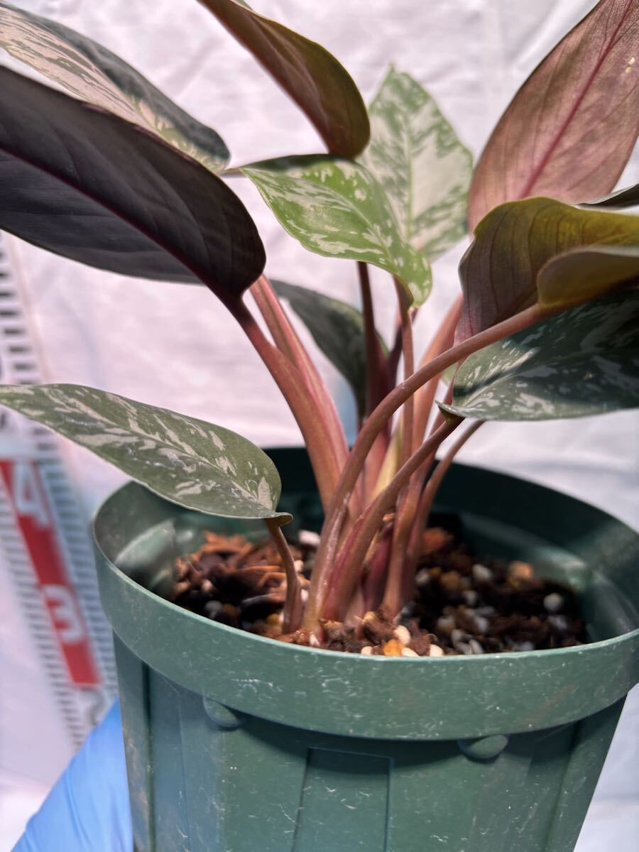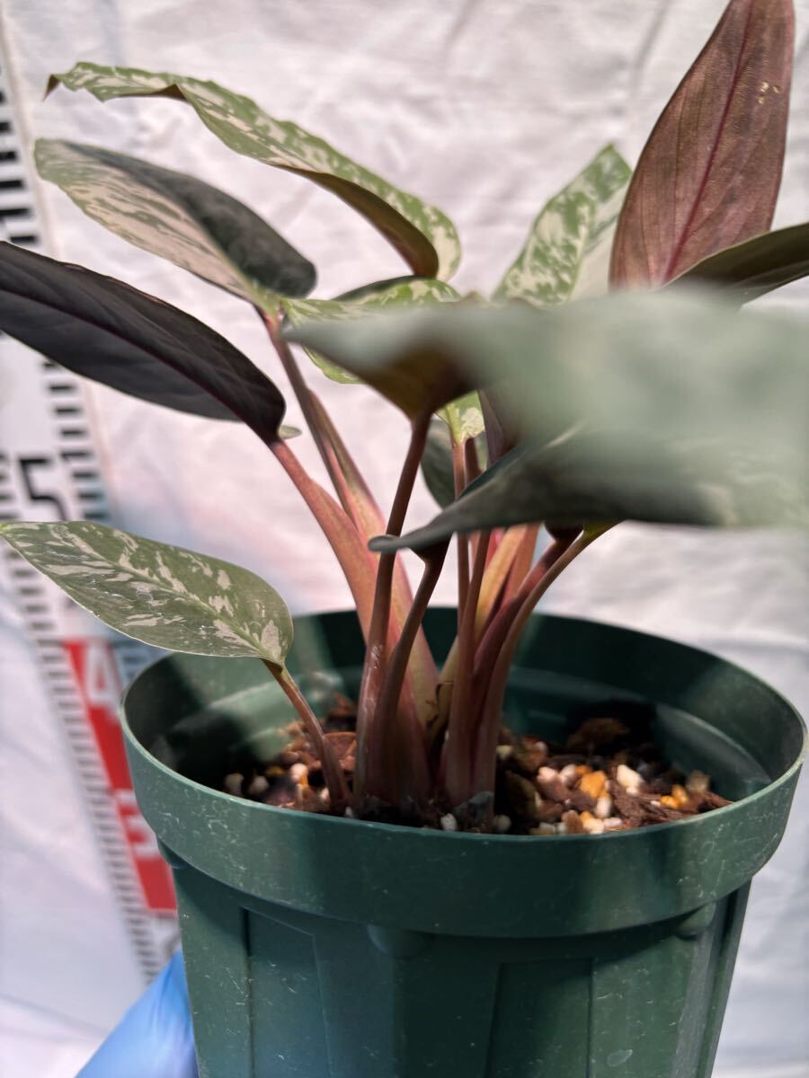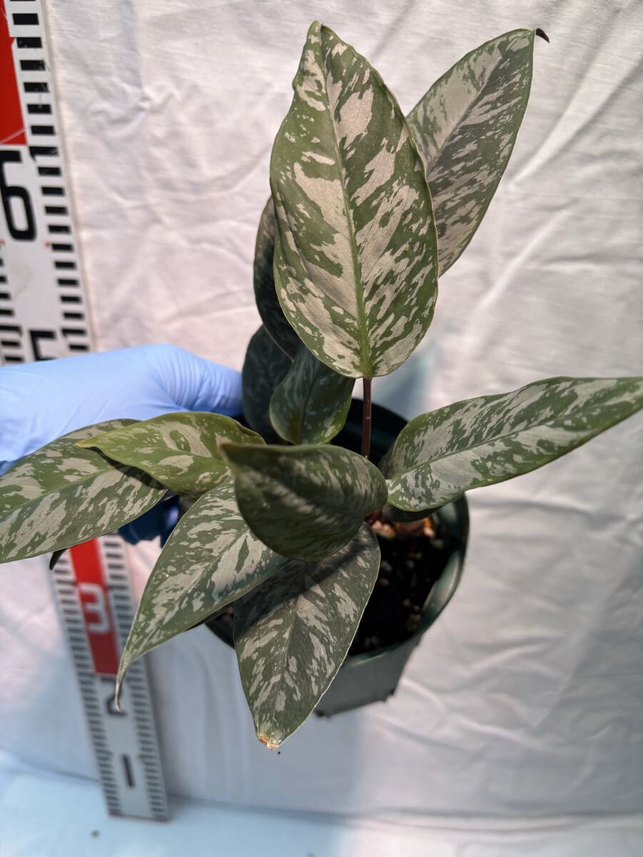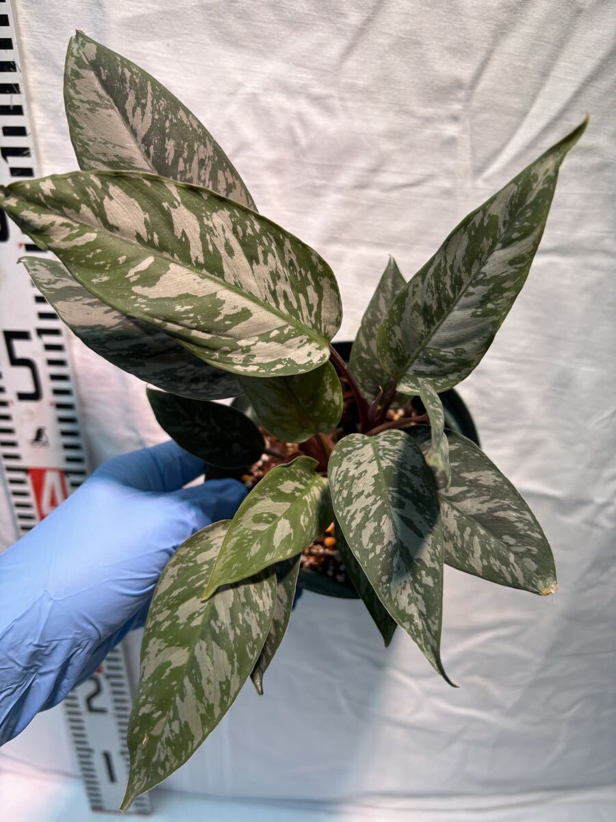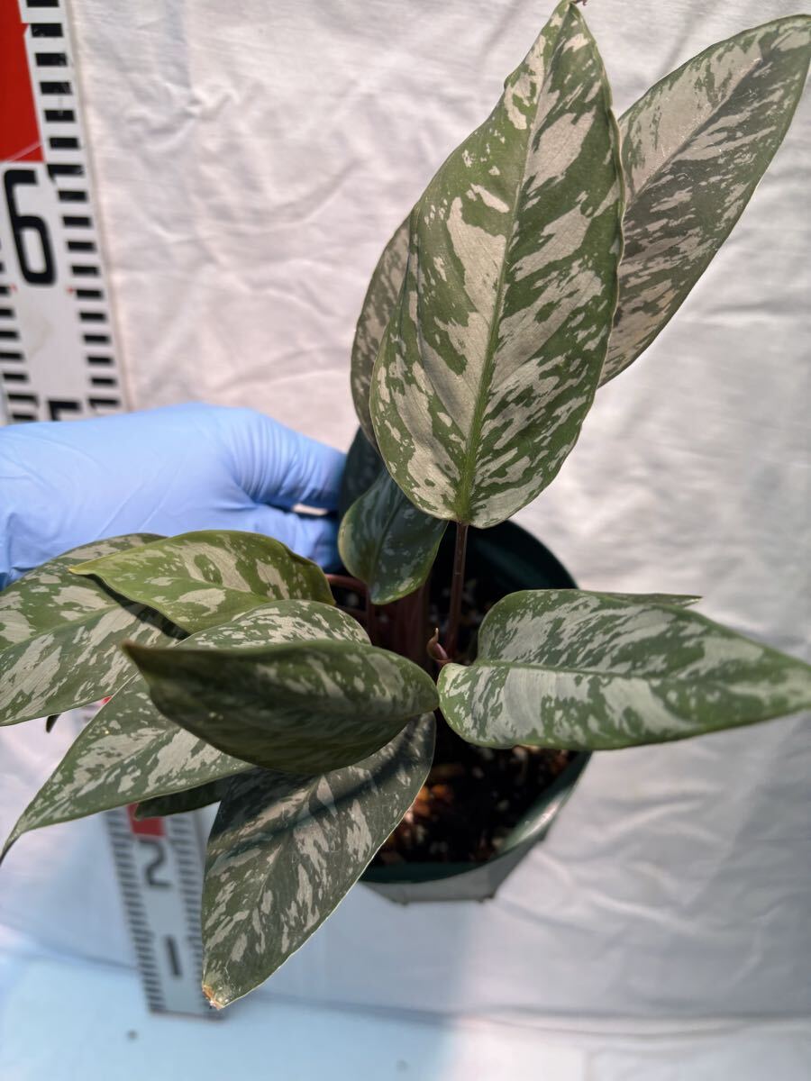 濃いグリーンにシルバー系の斑が美しい、サトイモ科の観葉植物アポバリス:アクミナティッシマです。バーガンディカラーの葉裏とのコントラストも美しいです。比較的湿潤な環境を好みます。アグラオネマと同じようなイメージの育てられます。質感、紋様が非常に美しいアポバリスの葉裏はカラテアの様にボルドー色でコントラストが美しいですが、質感が異なります。未だ日本ではメジャーな植物ではなく、あまり見かけない植物。