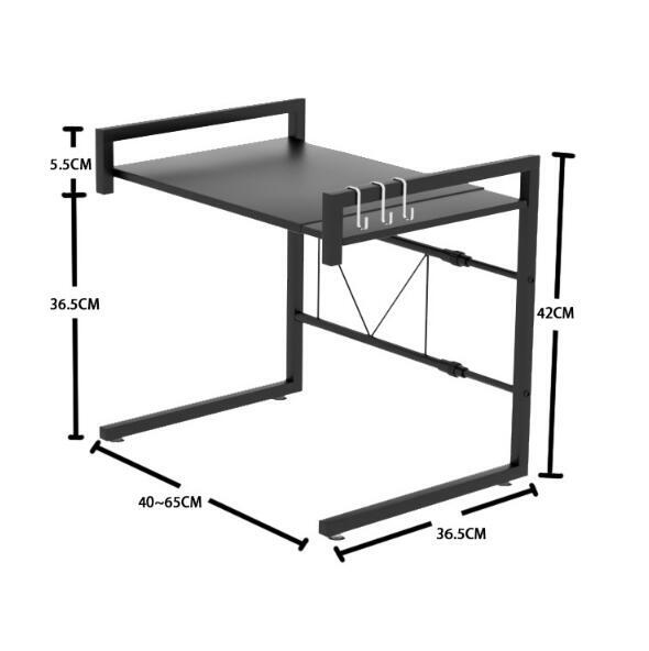 *サイズ* 本体/幅40-65×奥行36.5×高さ42cm(伸縮可能範囲25cm)(40-65cm) *材質* スチール(粉体塗装) *耐荷重* 棚30kg、各フック/500g *備考:簡単な組立が必要です。