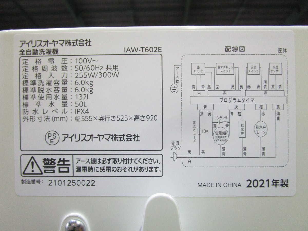 ☆IRISOHYAMA アイリスオーヤマ 全自動洗濯機 6.0kg 部屋干しモード 槽洗浄・槽乾燥コース IAW-T602E 2021年製 直接引取OK w103116