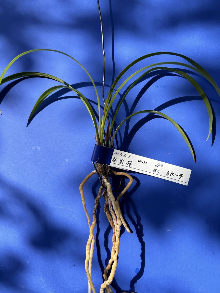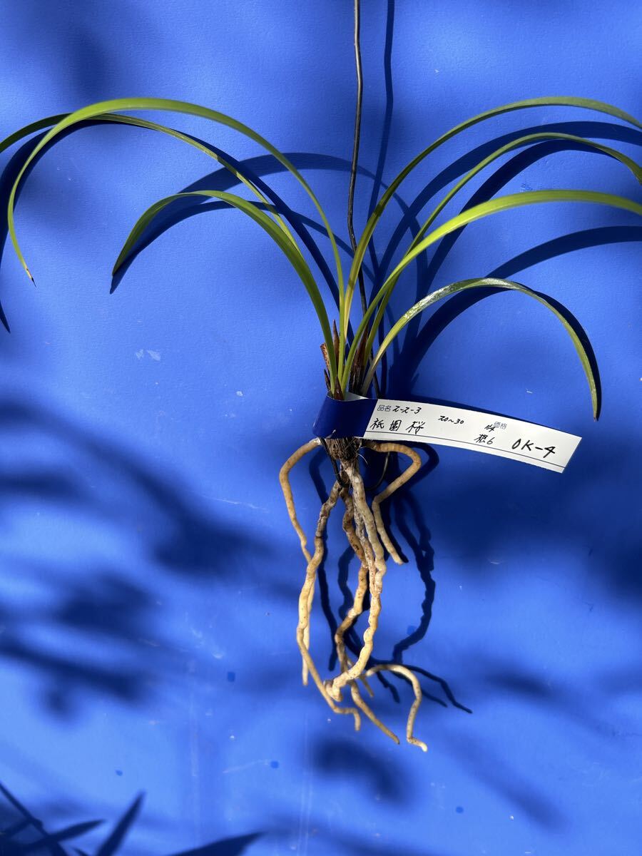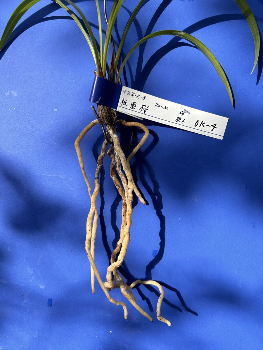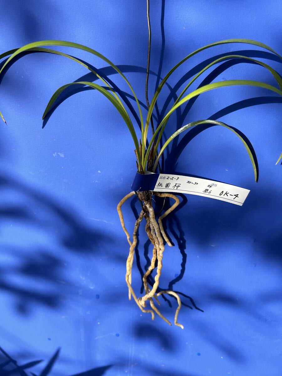 栽培増植品、土佐寒蘭、登録品、祇園桜、OKー 4、は、高知県産の桃三角の登録品で、有名品なので詳細は省きます。苗サイズは、2 0〜 3 0センチくらいの、2ー 2ー 3の 3条立てで、根は 6本です。水苔に包んで発送します。