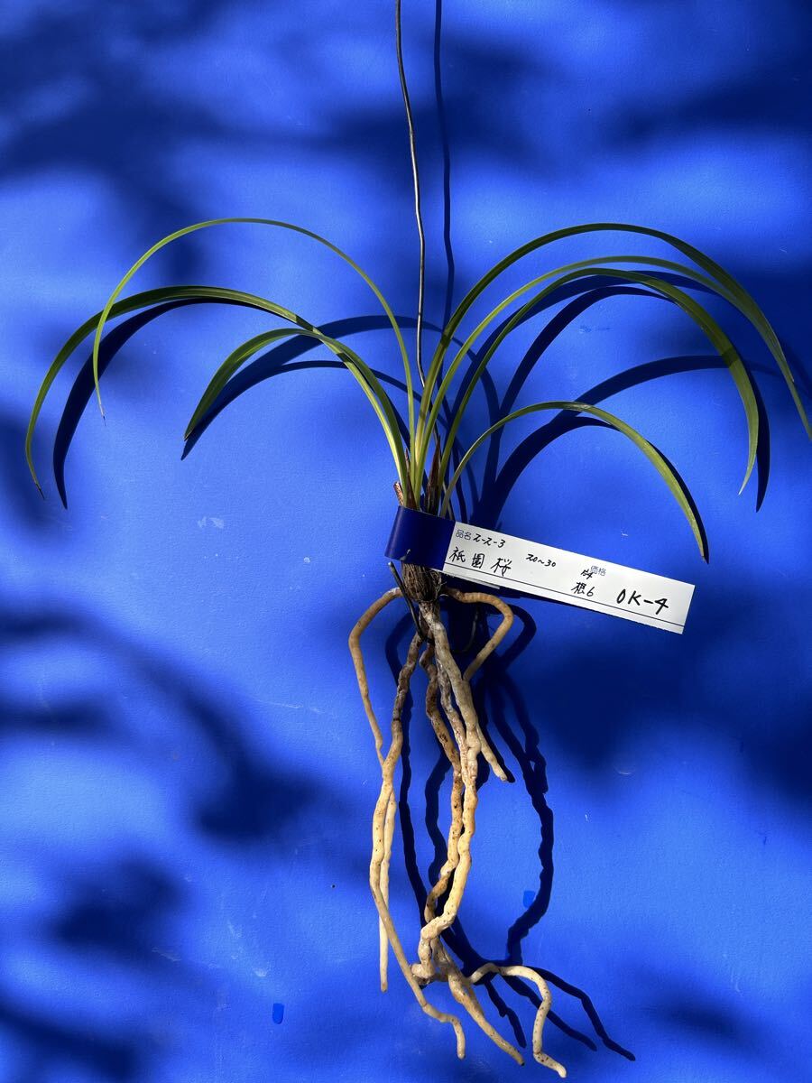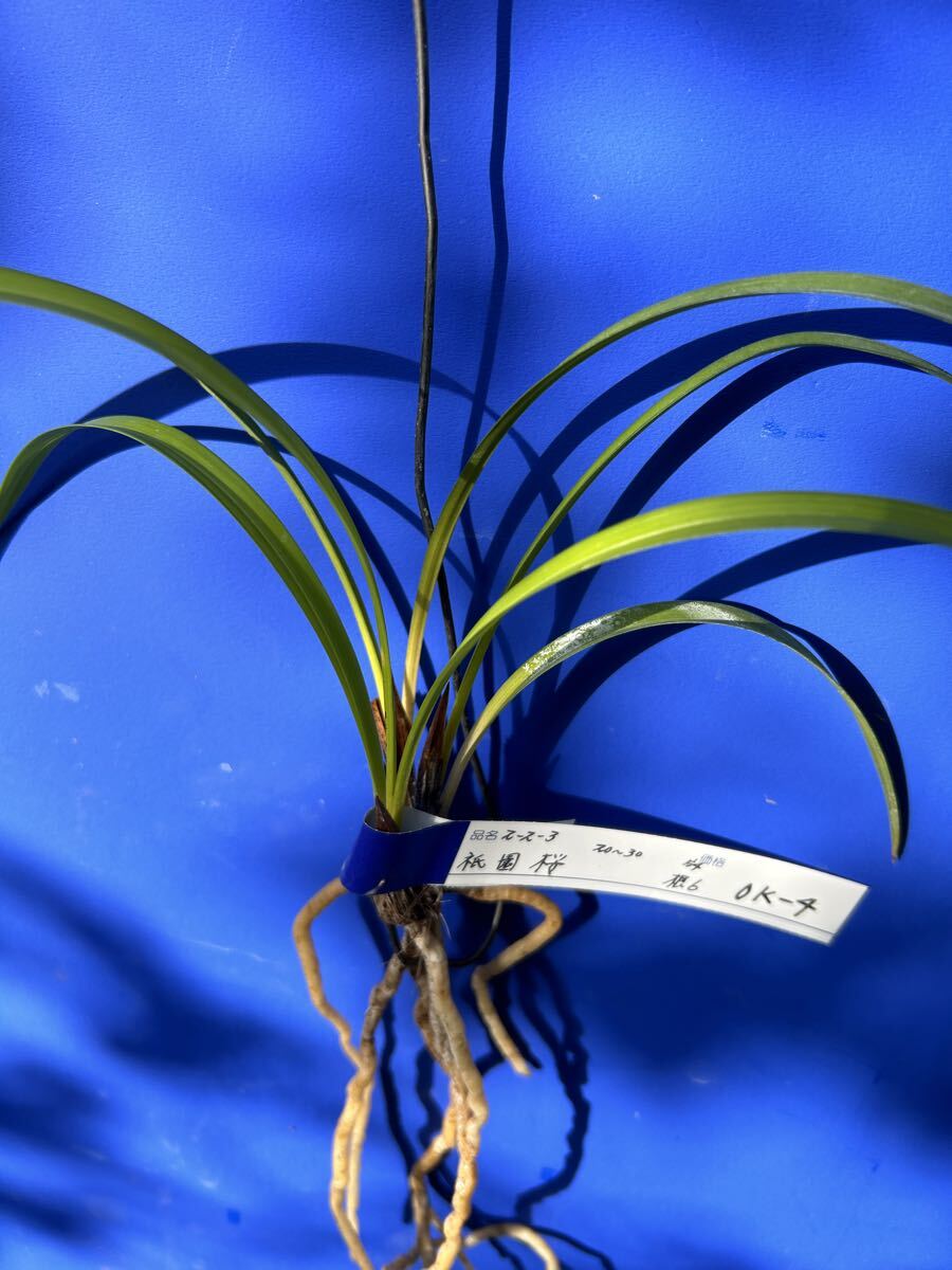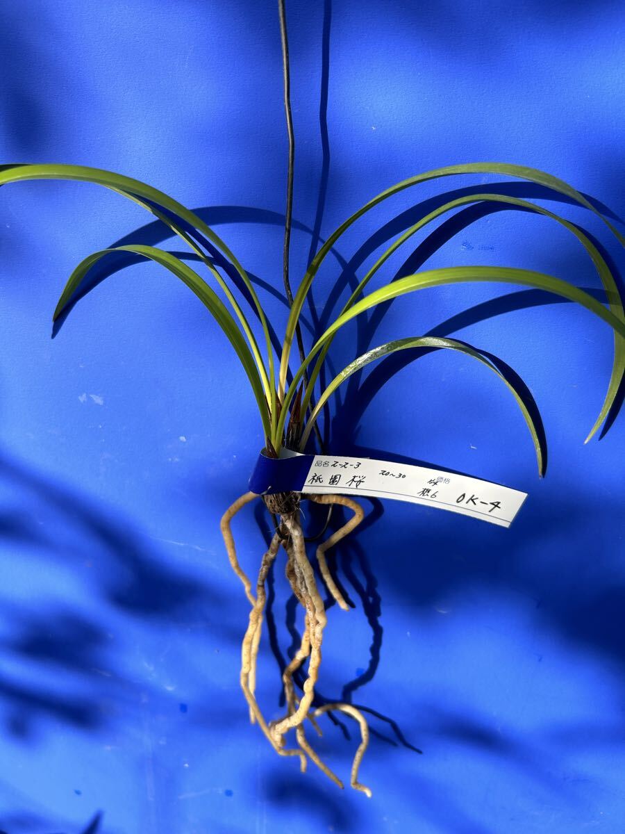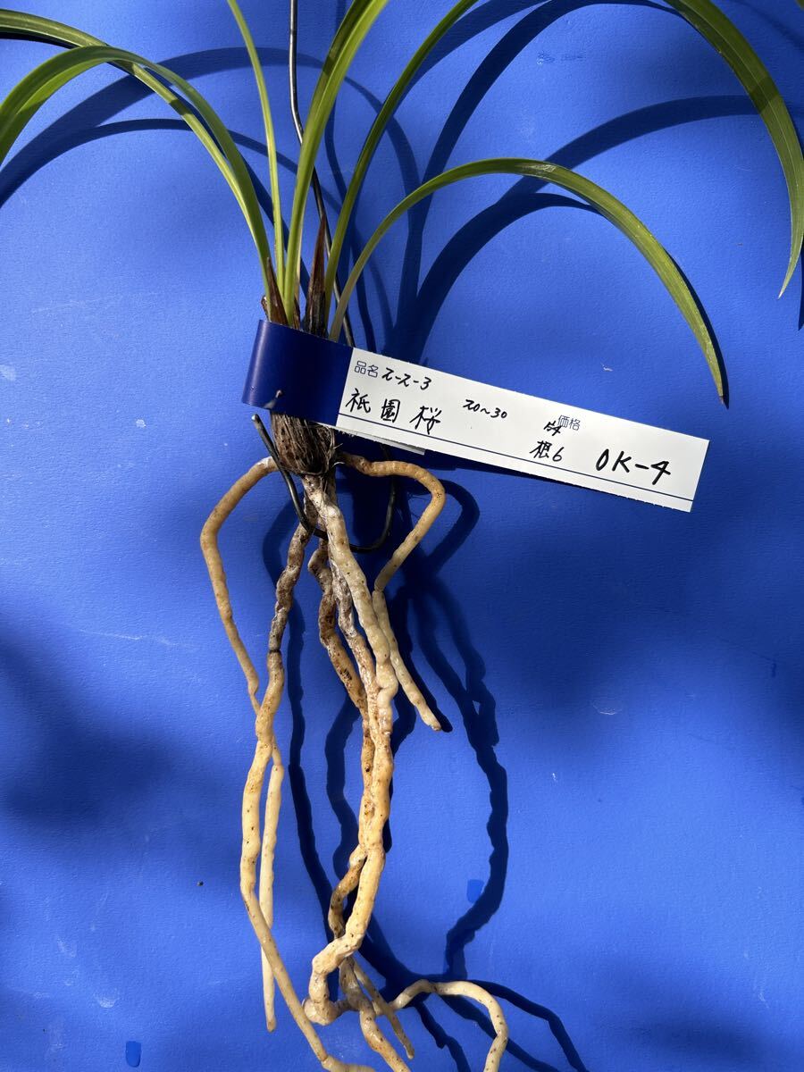 栽培増植品、土佐寒蘭、登録品、祇園桜、OKー 4、は、高知県産の桃三角の登録品で、有名品なので詳細は省きます。苗サイズは、2 0〜 3 0センチくらいの、2ー 2ー 3の 3条立てで、根は 6本です。水苔に包んで発送します。