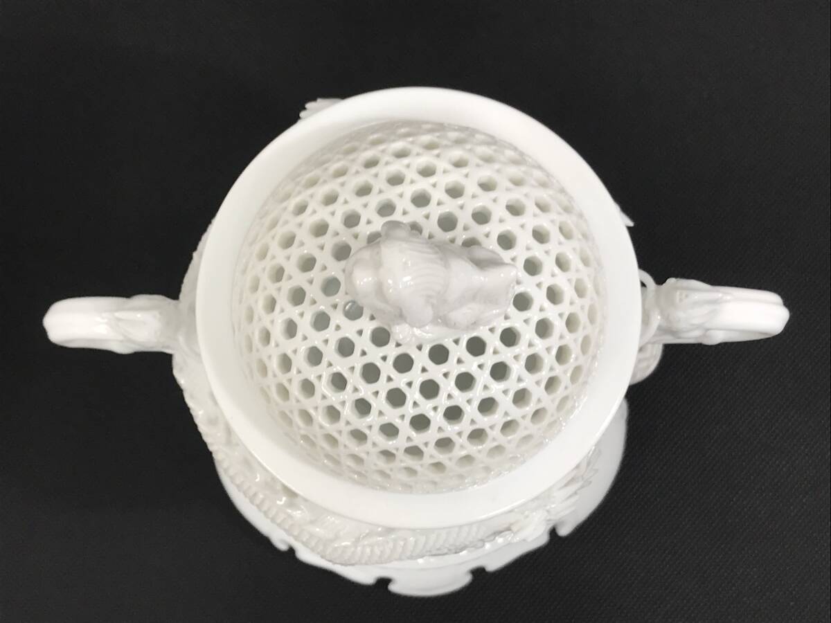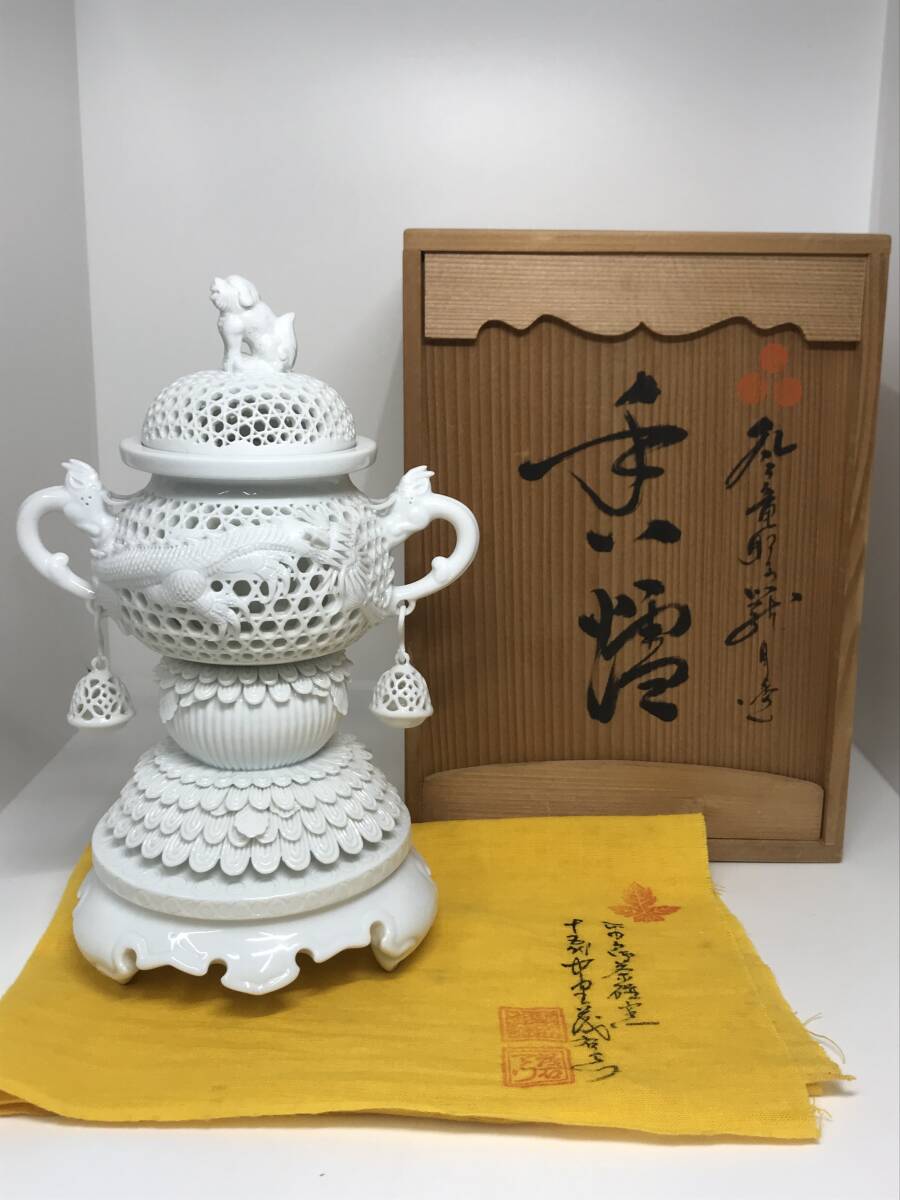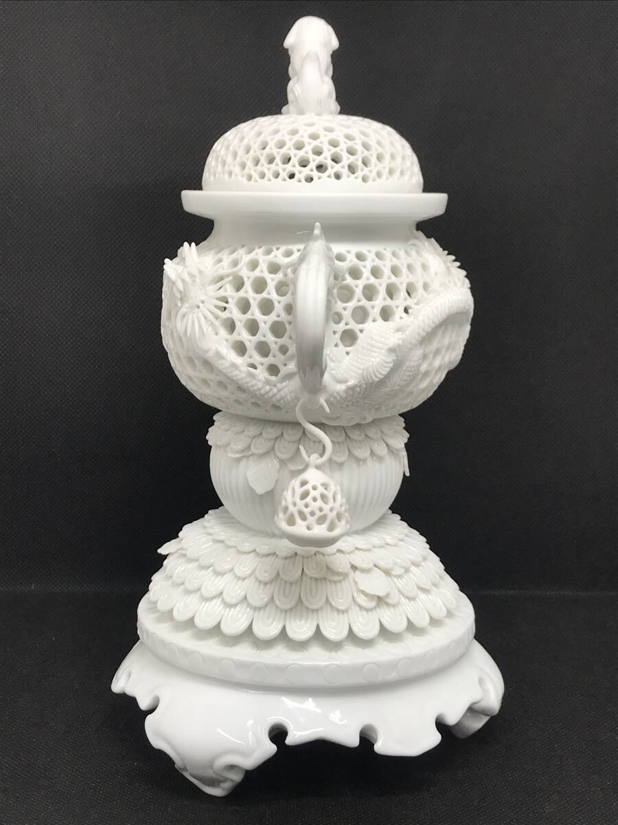 平戸焼 十五代 中里茂右衛門造 白磁 竜巻彫籠目透 獅子蓋 香炉 陶器 陶磁器 陶印 在銘 陶芸 伝統工芸品 美術品 古美術品 趣味 コレクター