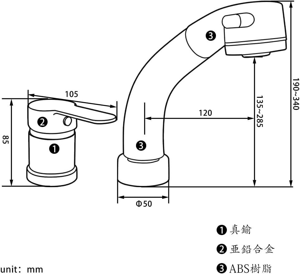 •  ホース引き出し式、吐水口昇降、360°回転: ホース引き出し最大長さ約55 cm、吐水口昇降最大高さ約14 cm、360°自由に引き出せるノズルは、洗髪にとても便利です